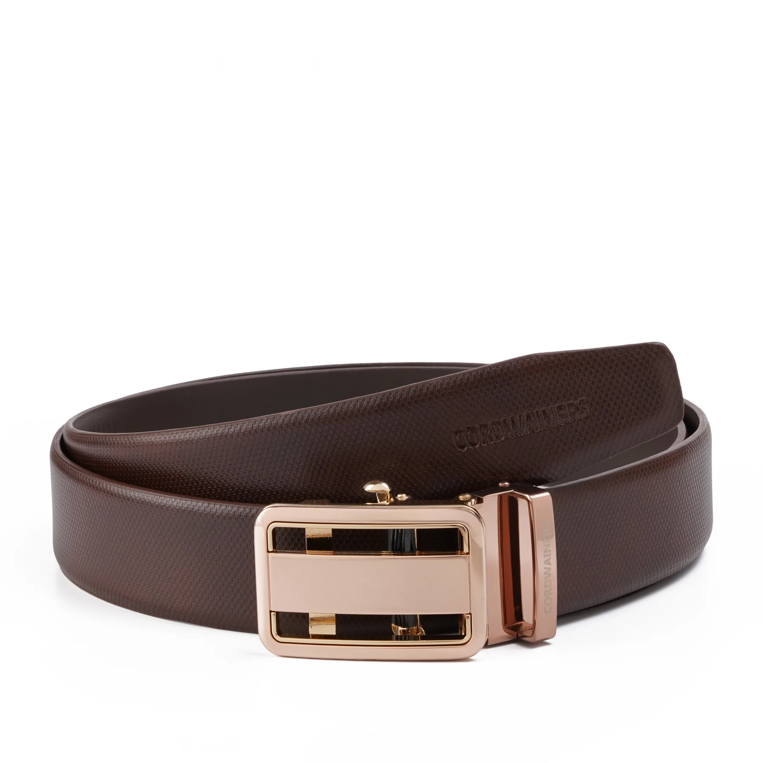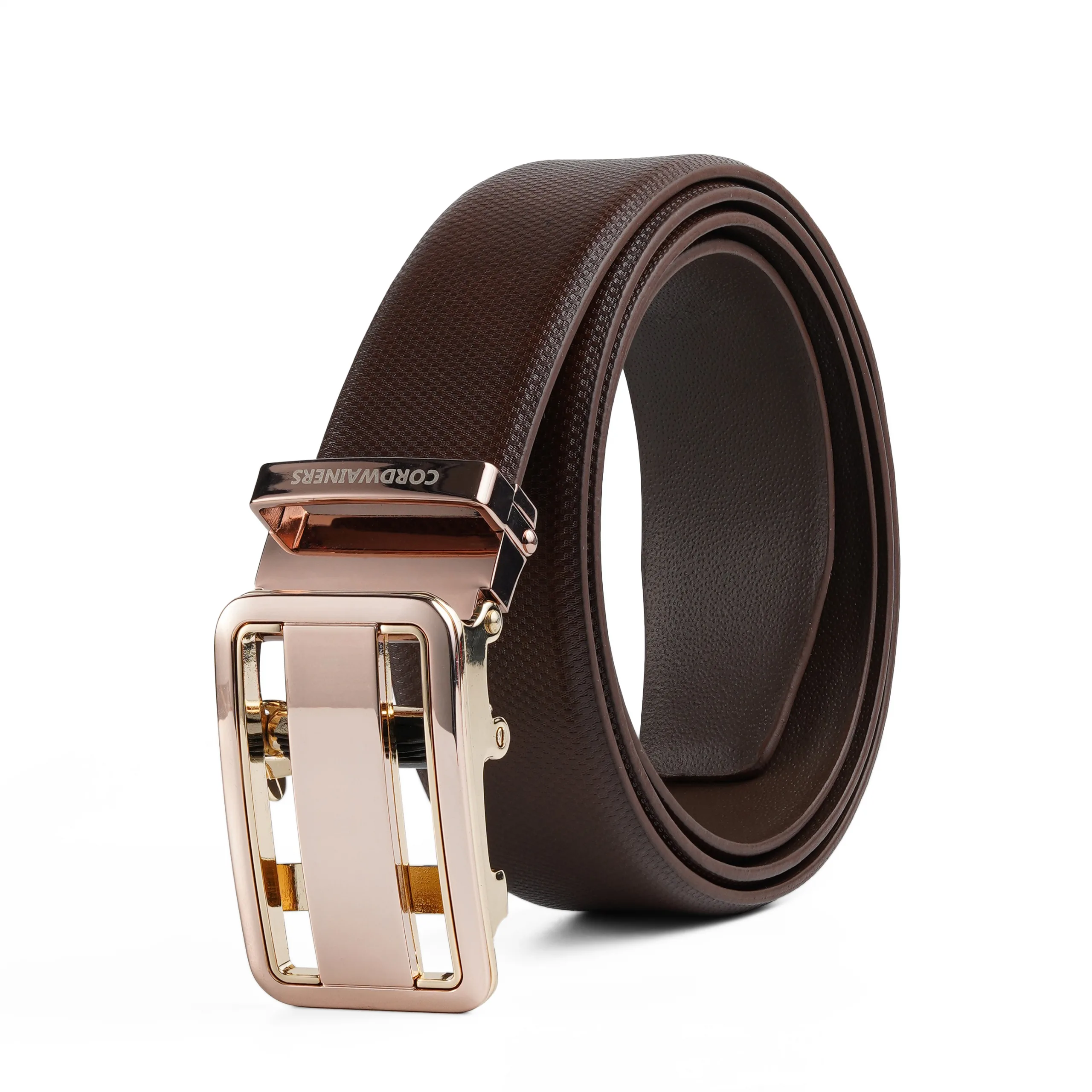 Elevate your style with this brown leather belt, enhanced with a golden auto lock buckle that blends luxury and practicality.