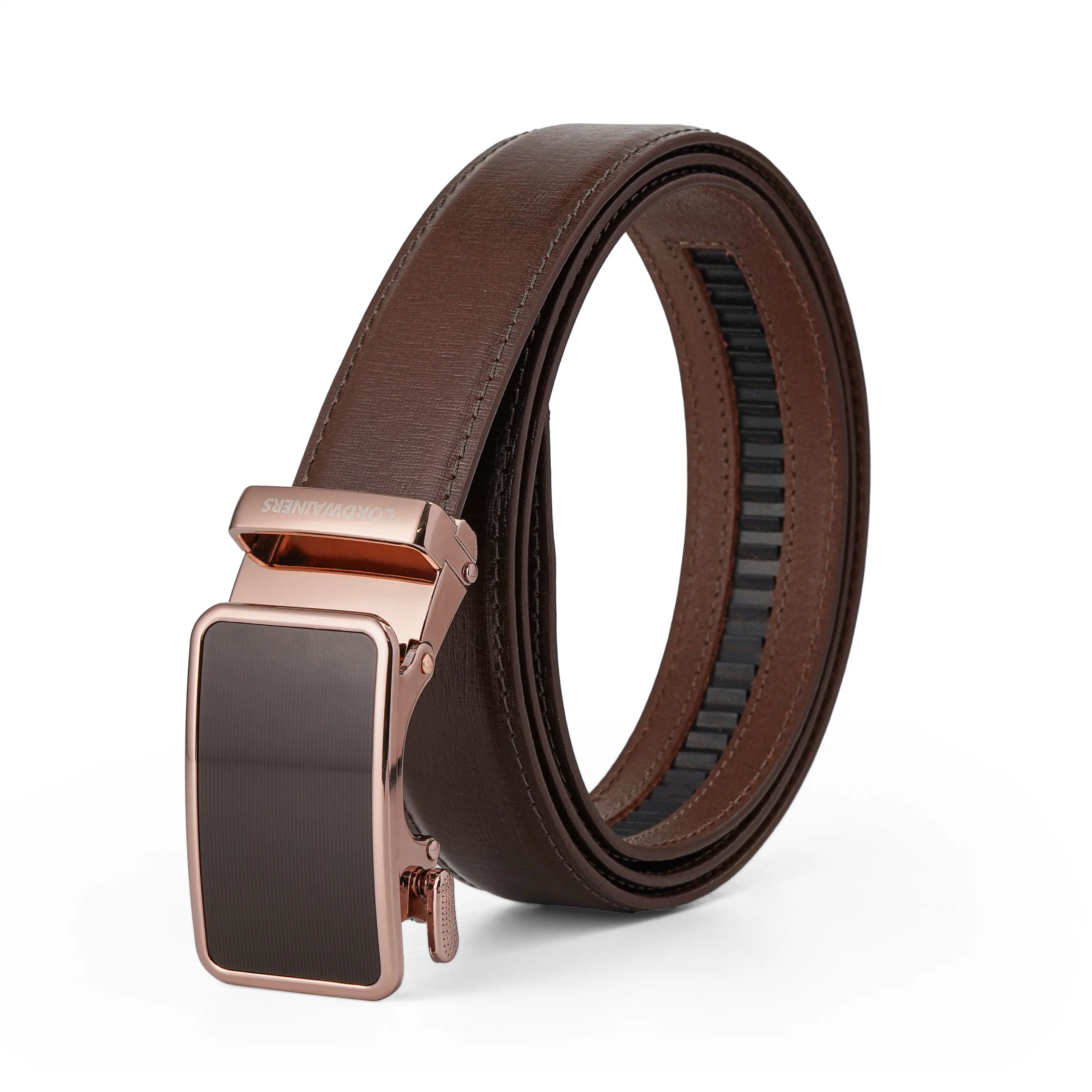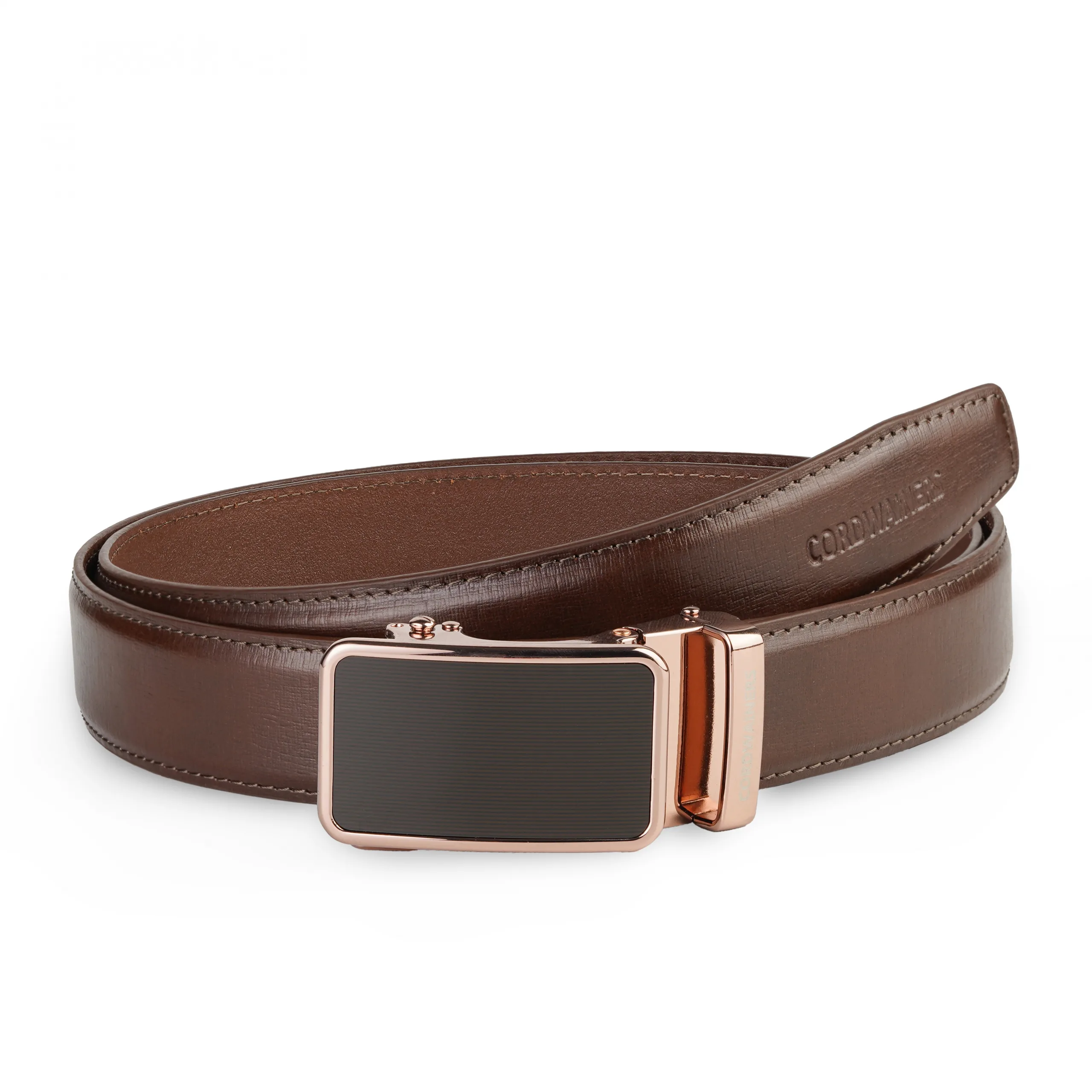 Crafted for the modern gentleman, this brown leather belt with a rose gold outline autolock buckle offers a perfect mix of refinement and everyday comfort. The sleek buckle detailing and rich brown tone add understated luxury to any outfit.