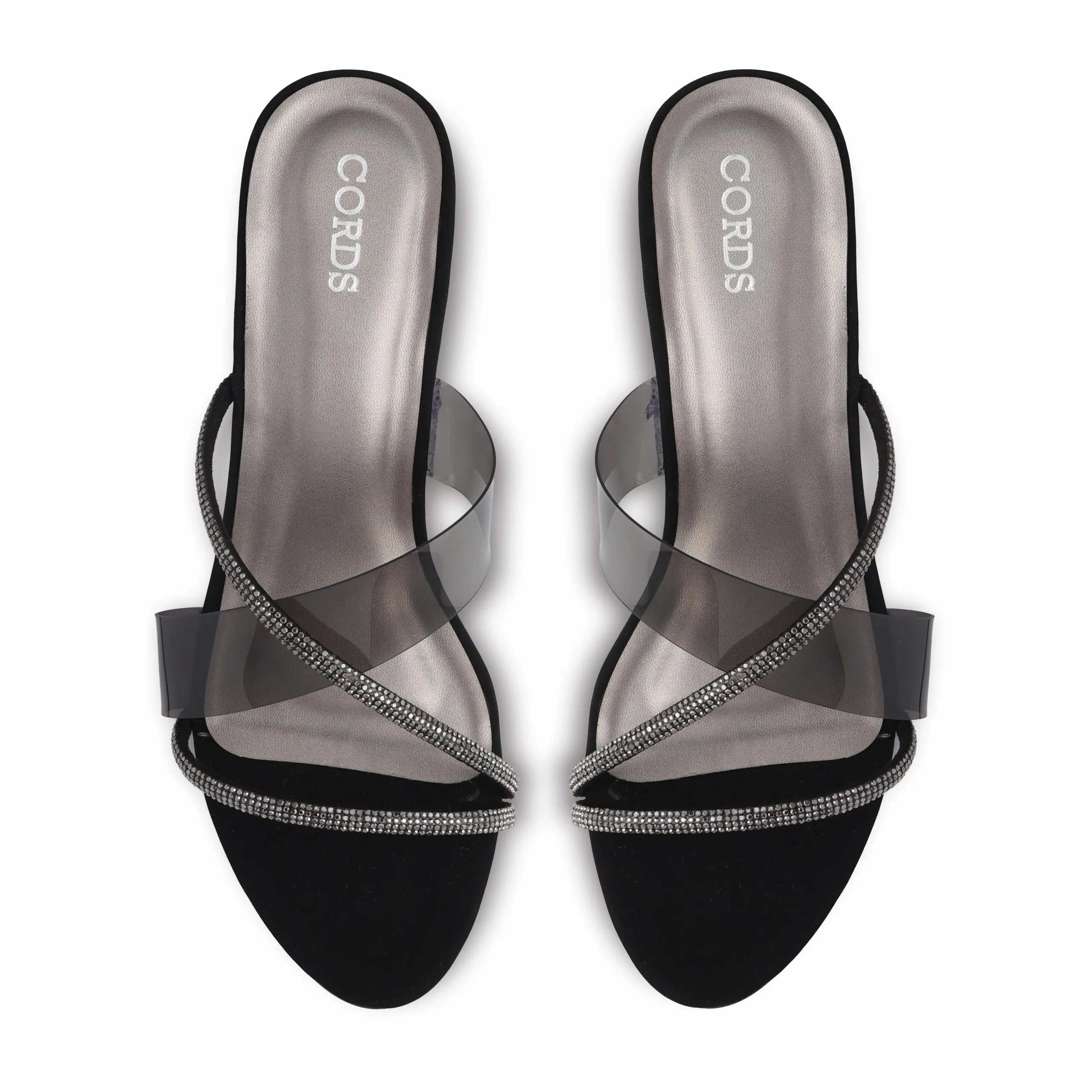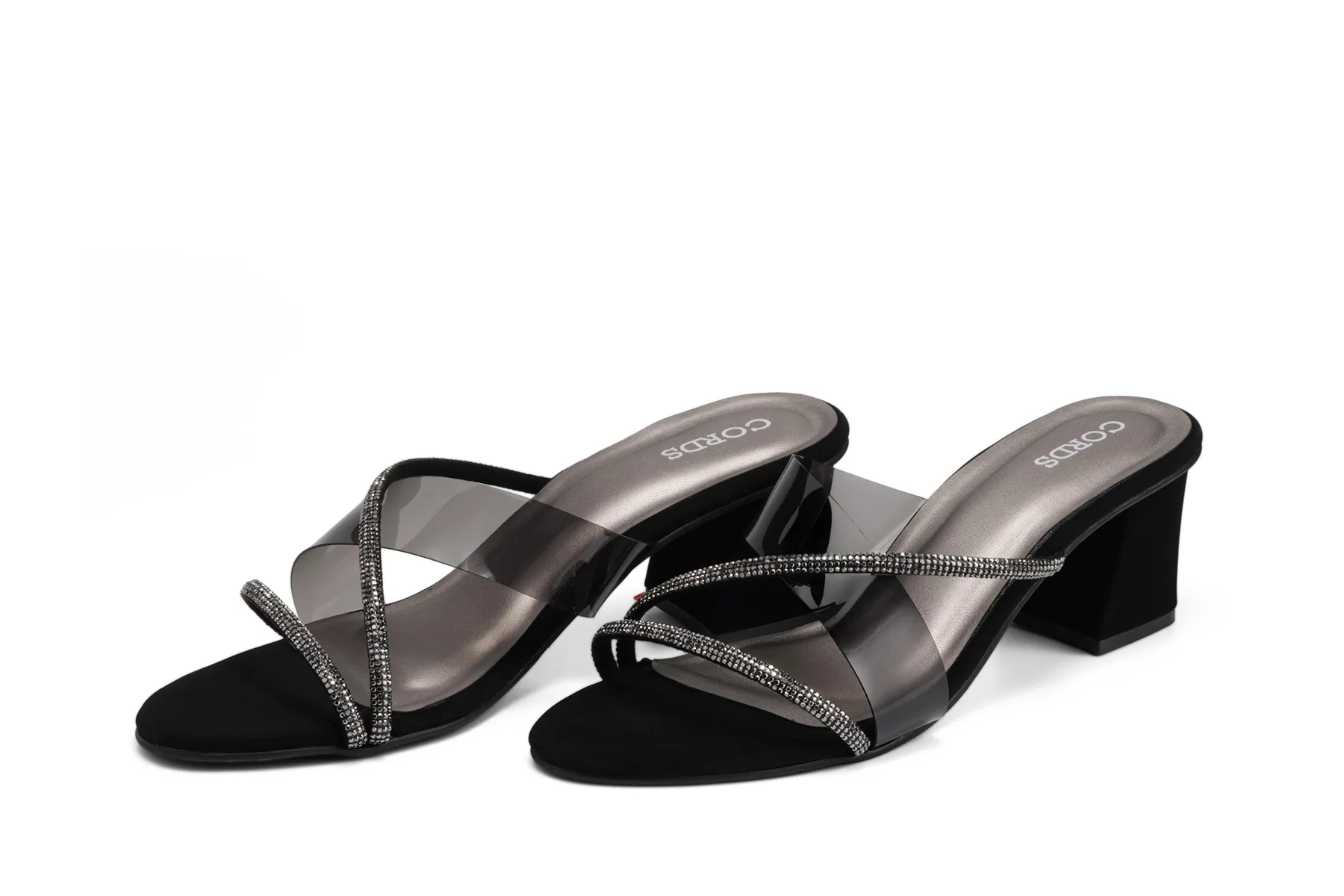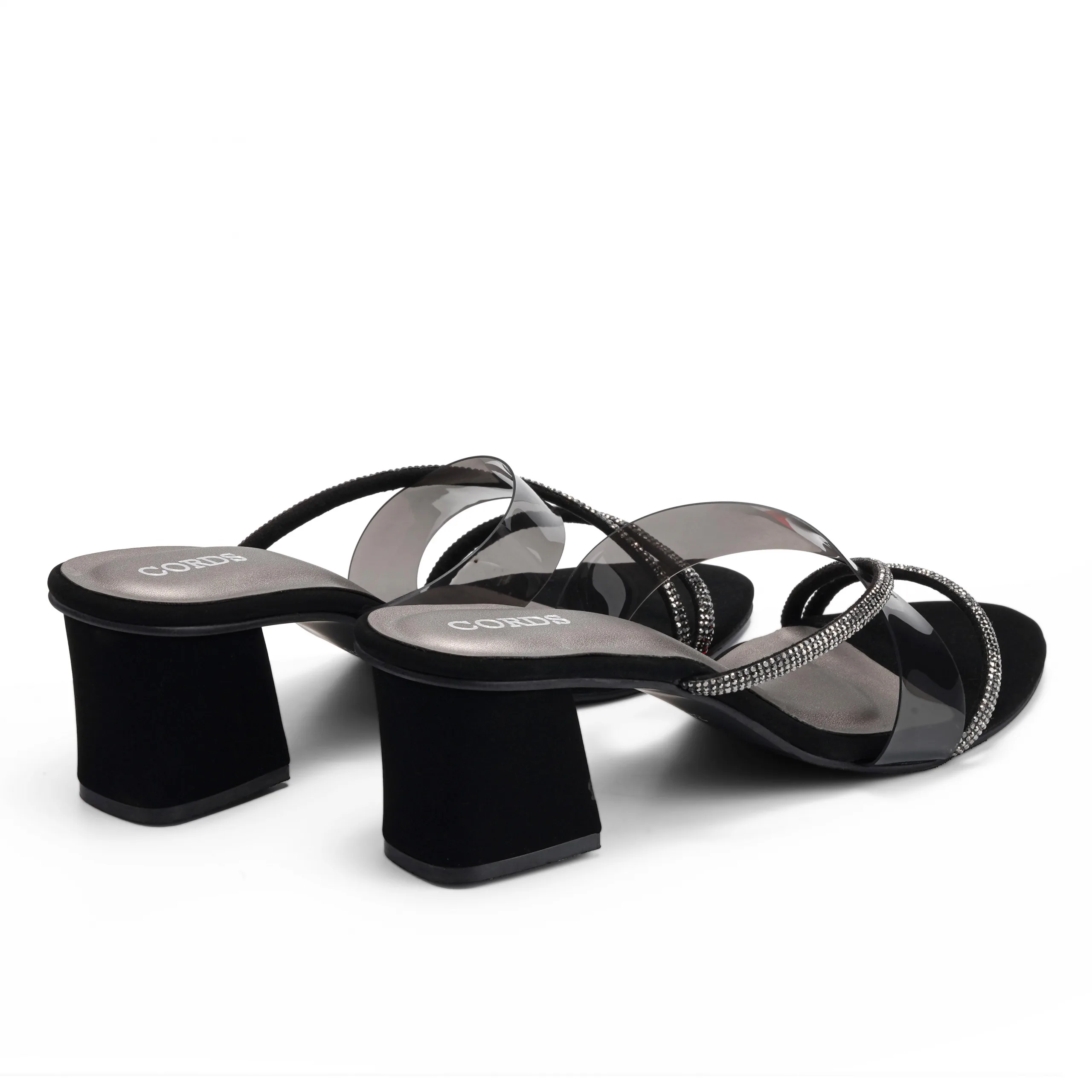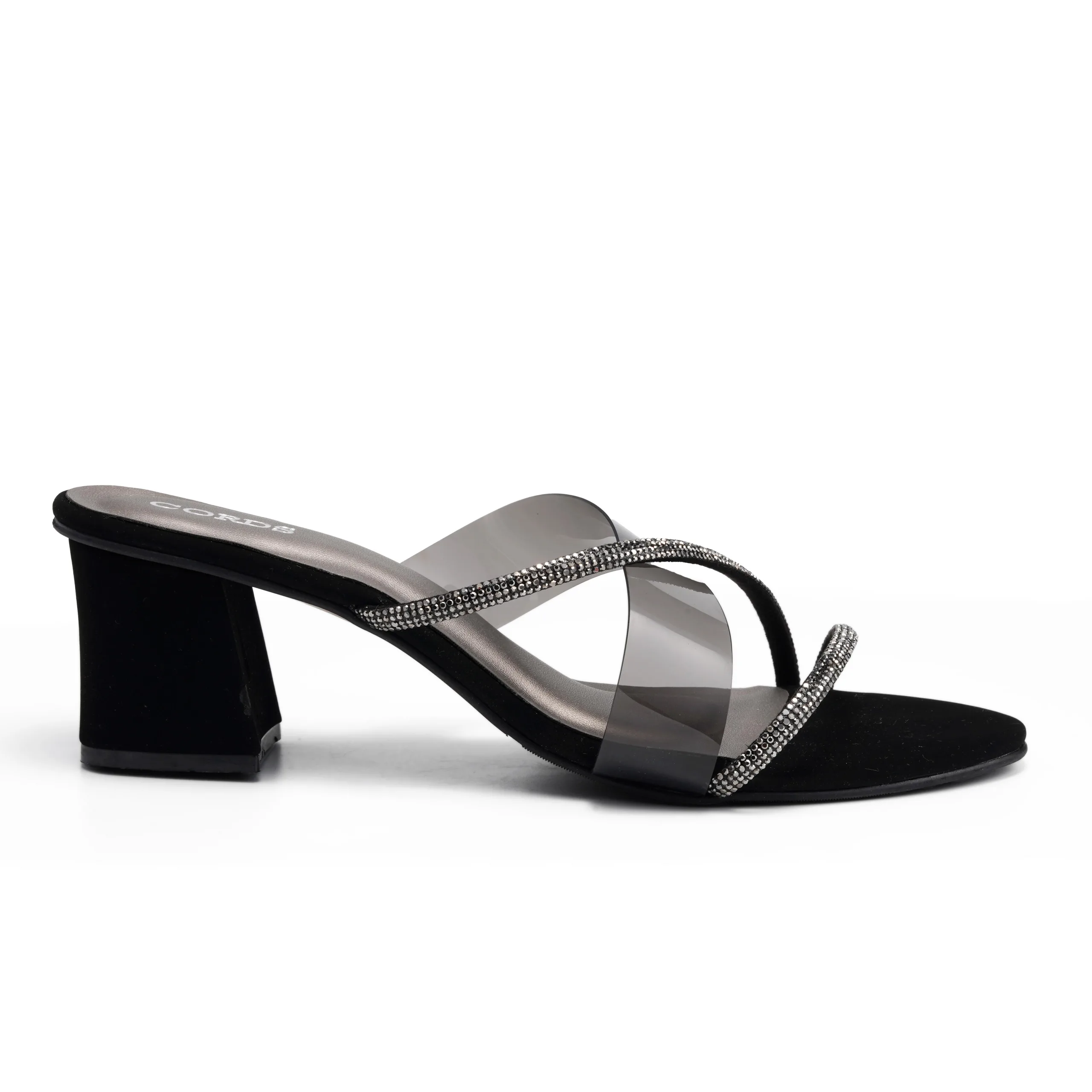 Designed to bring together comfort and glamour, these Black block heel slippers feature soft transparent TPU cross straps and a balanced heel. The modern yet minimal design makes them ideal for both casual outings and festive occasions.
