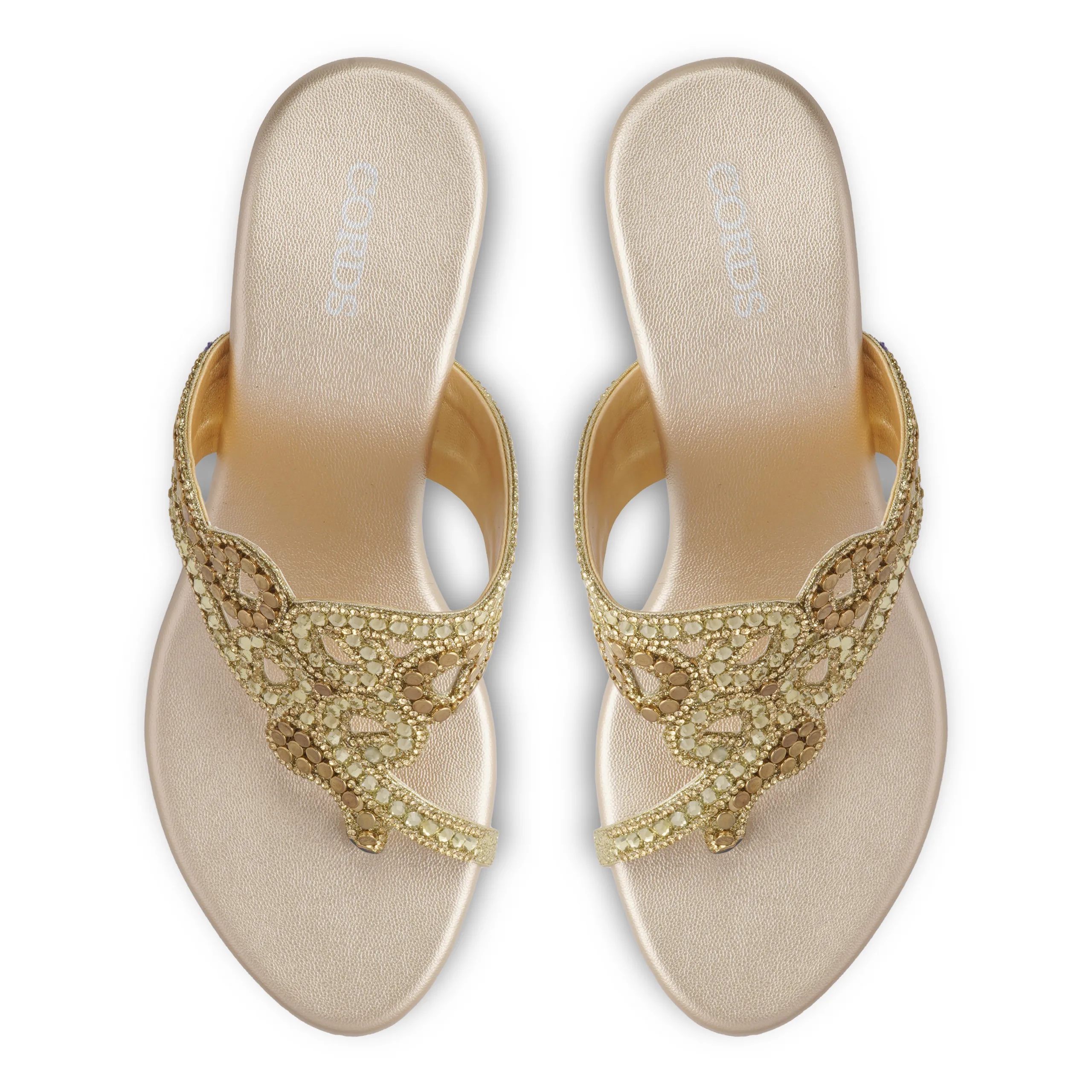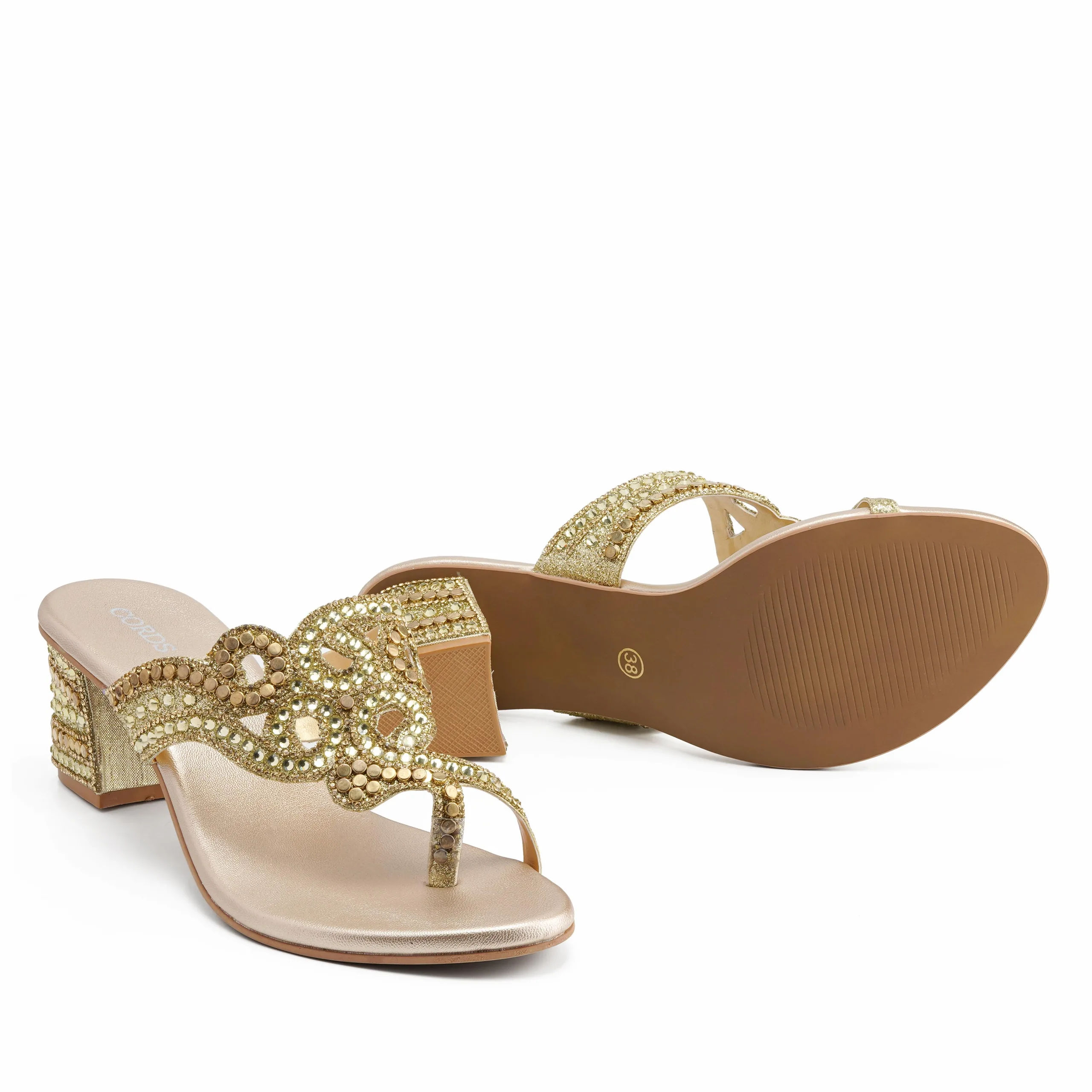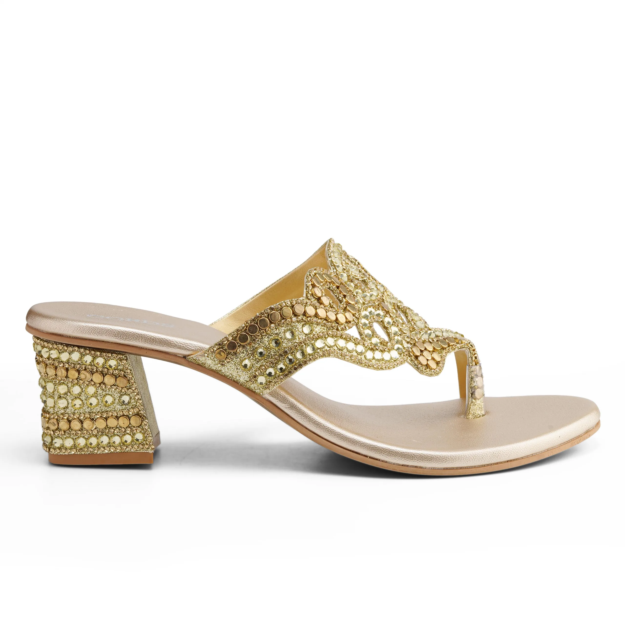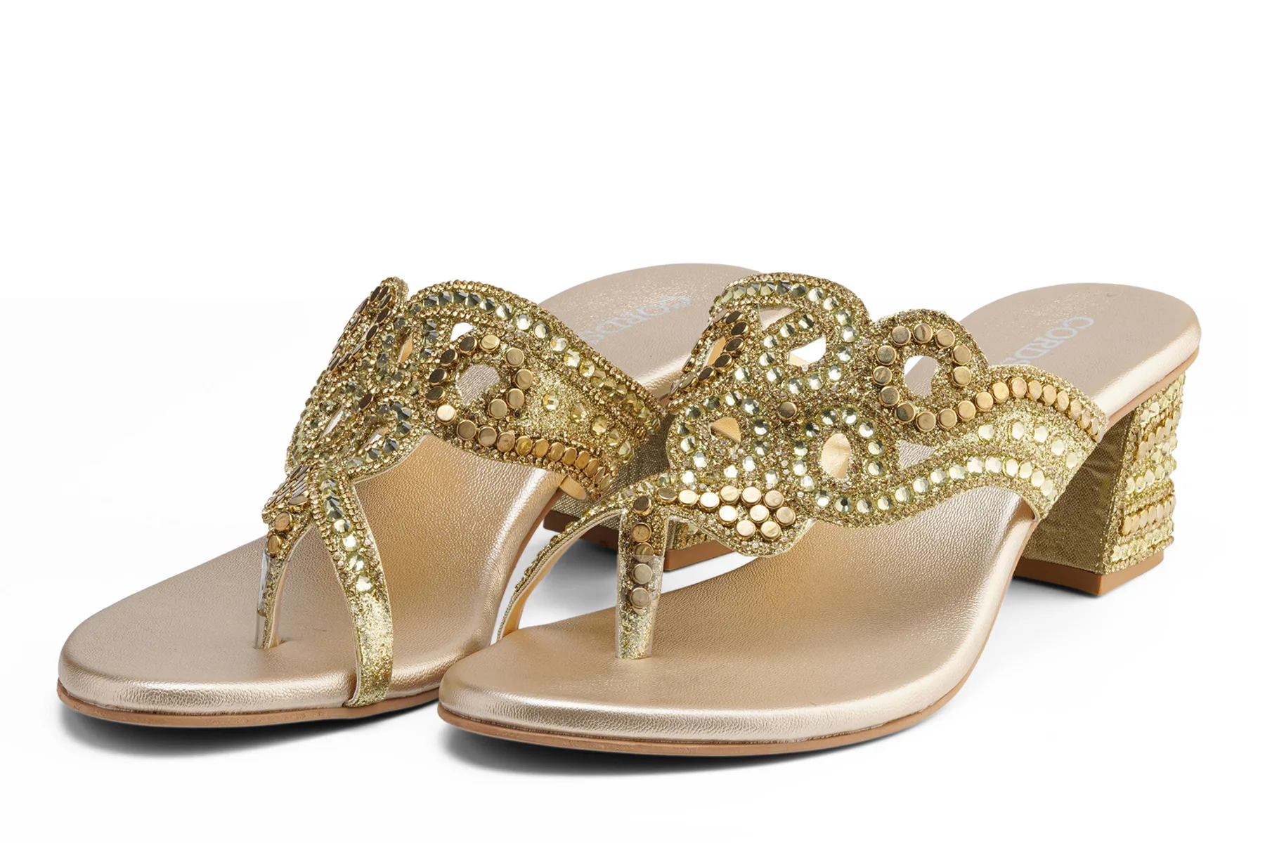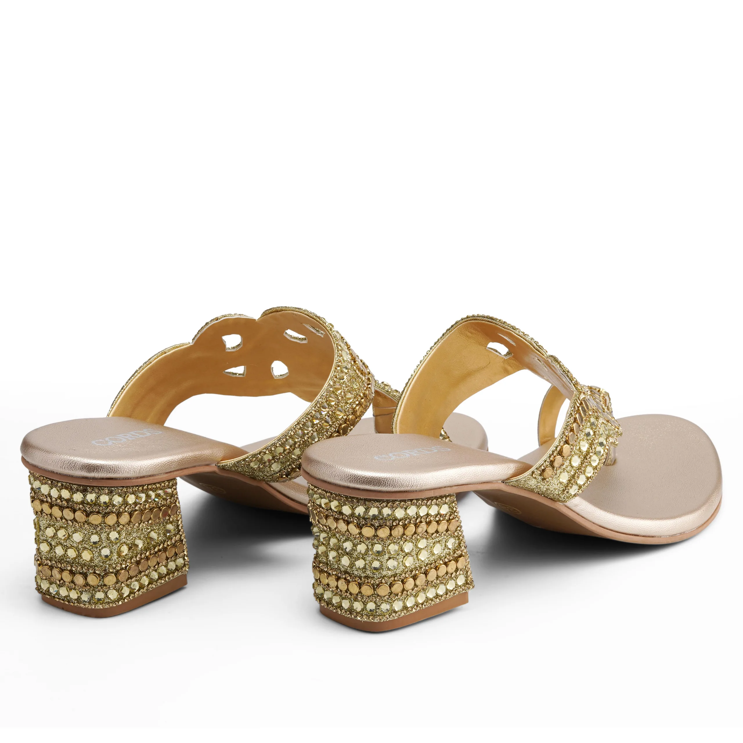 These Golden block heel slippers add a refined touch to any outfit — a must-have pair for every woman’s party wardrobe.