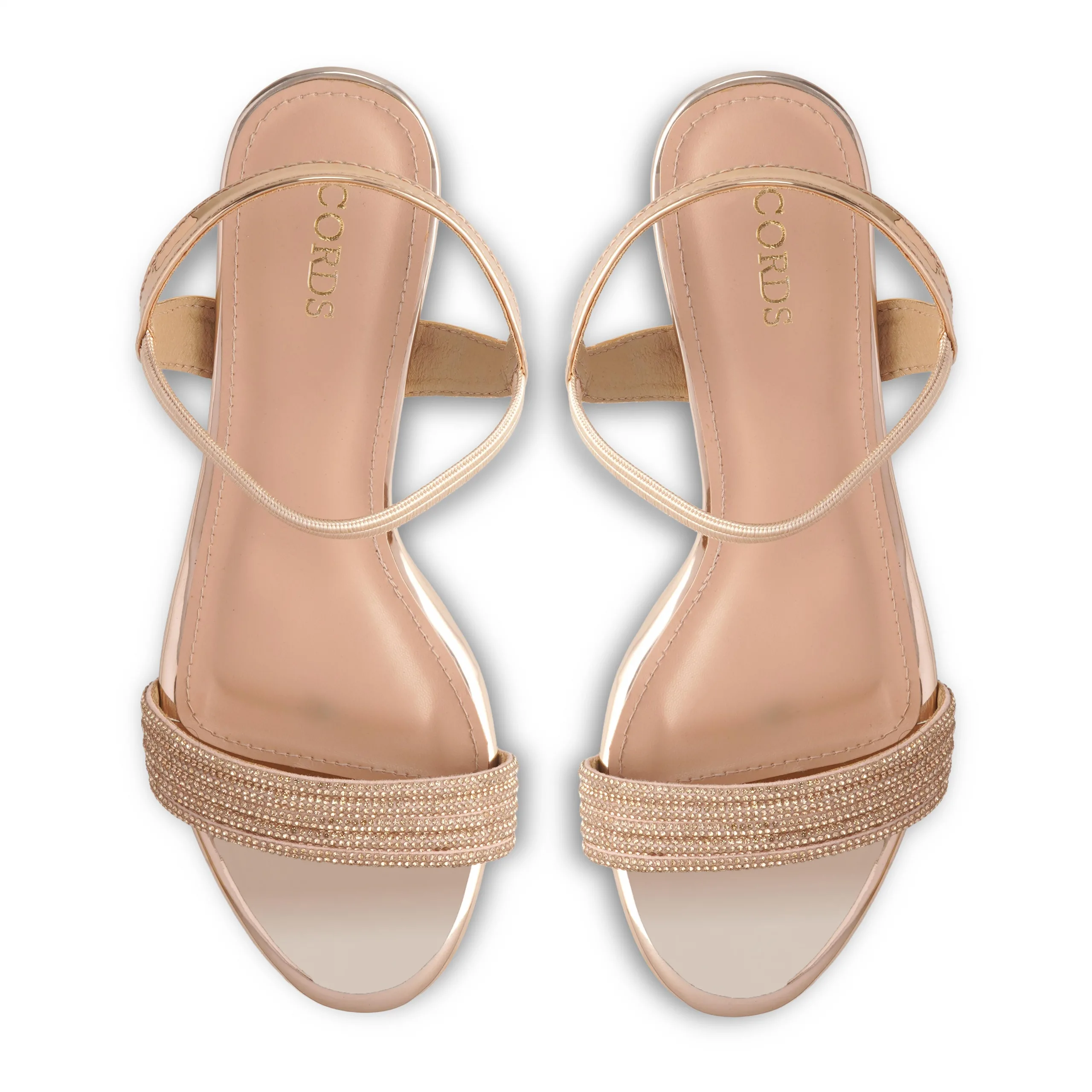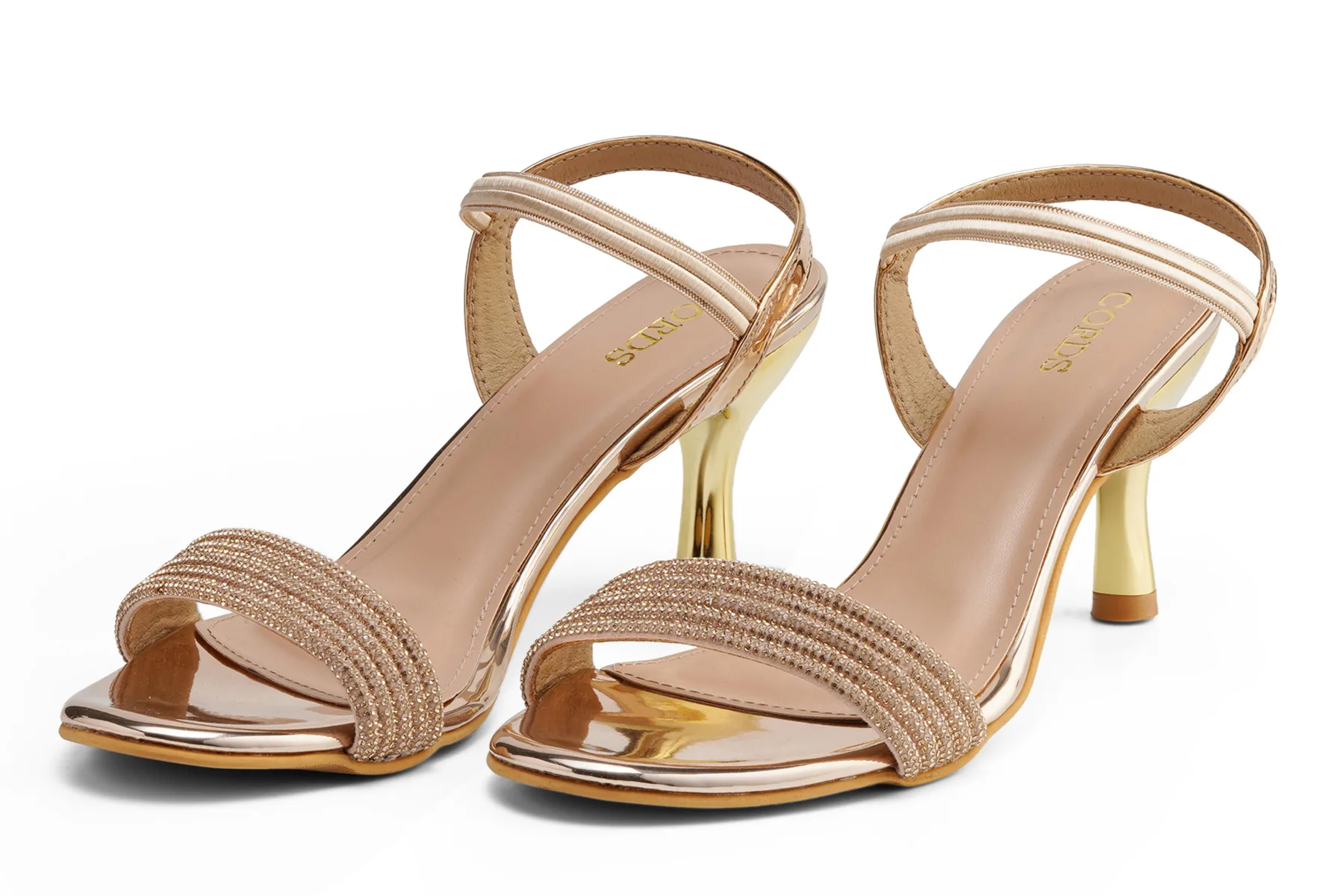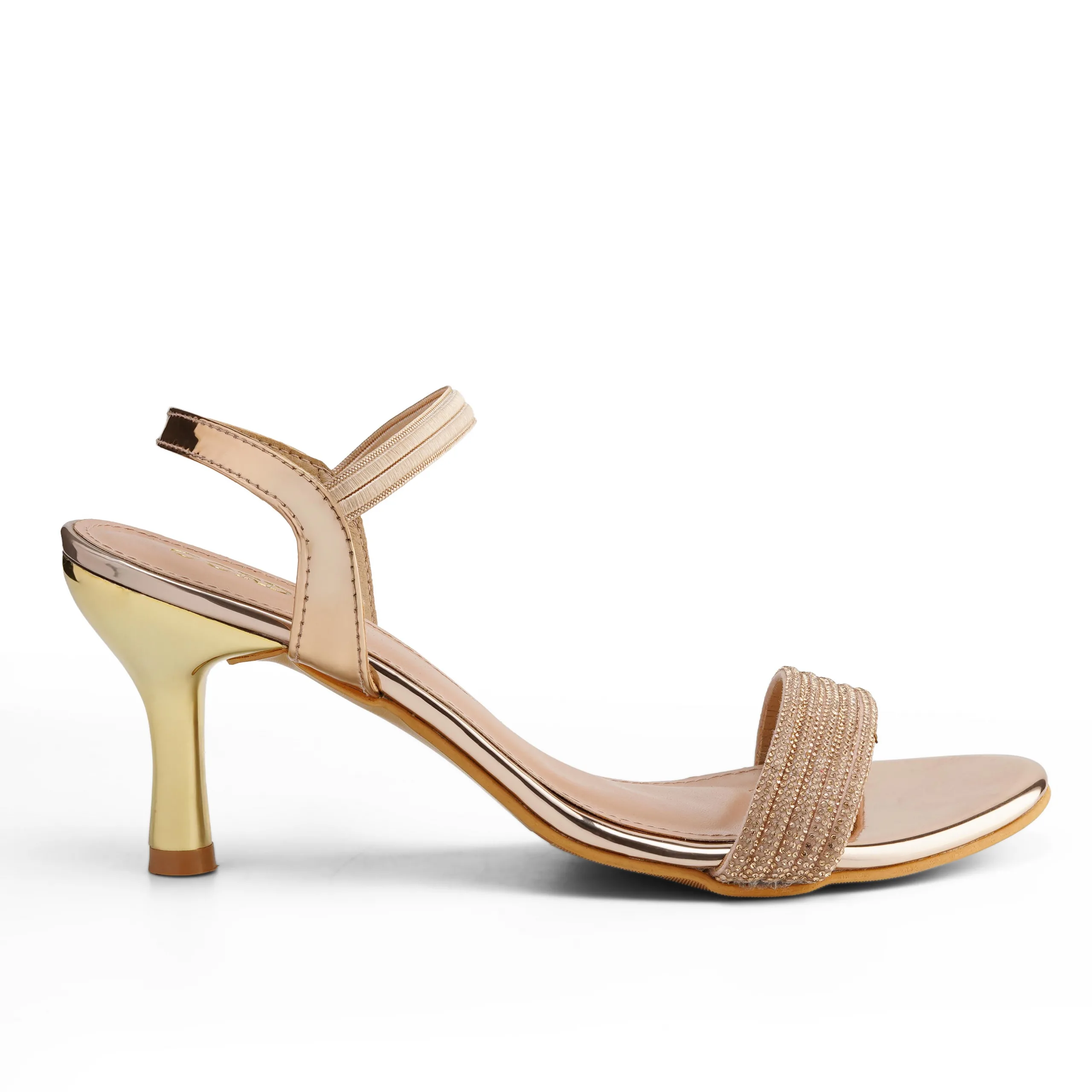 Add a touch of refined glamour to your outfit with these rose gold pencil heel sandals, designed with a shimmering golden strap for a hint of luxury. The comfortable heel height and TPR sole ensure balance and flexibility, making them the perfect pair for festive and evening occasions.