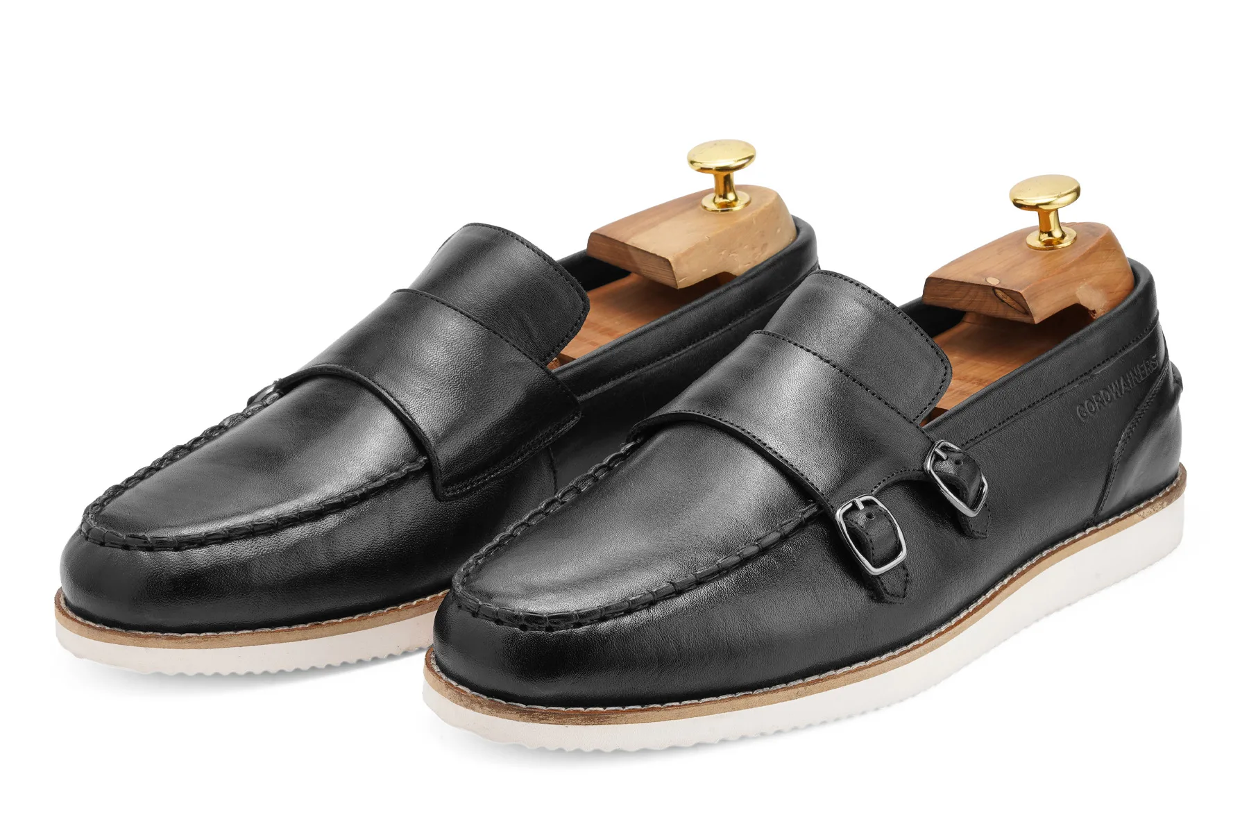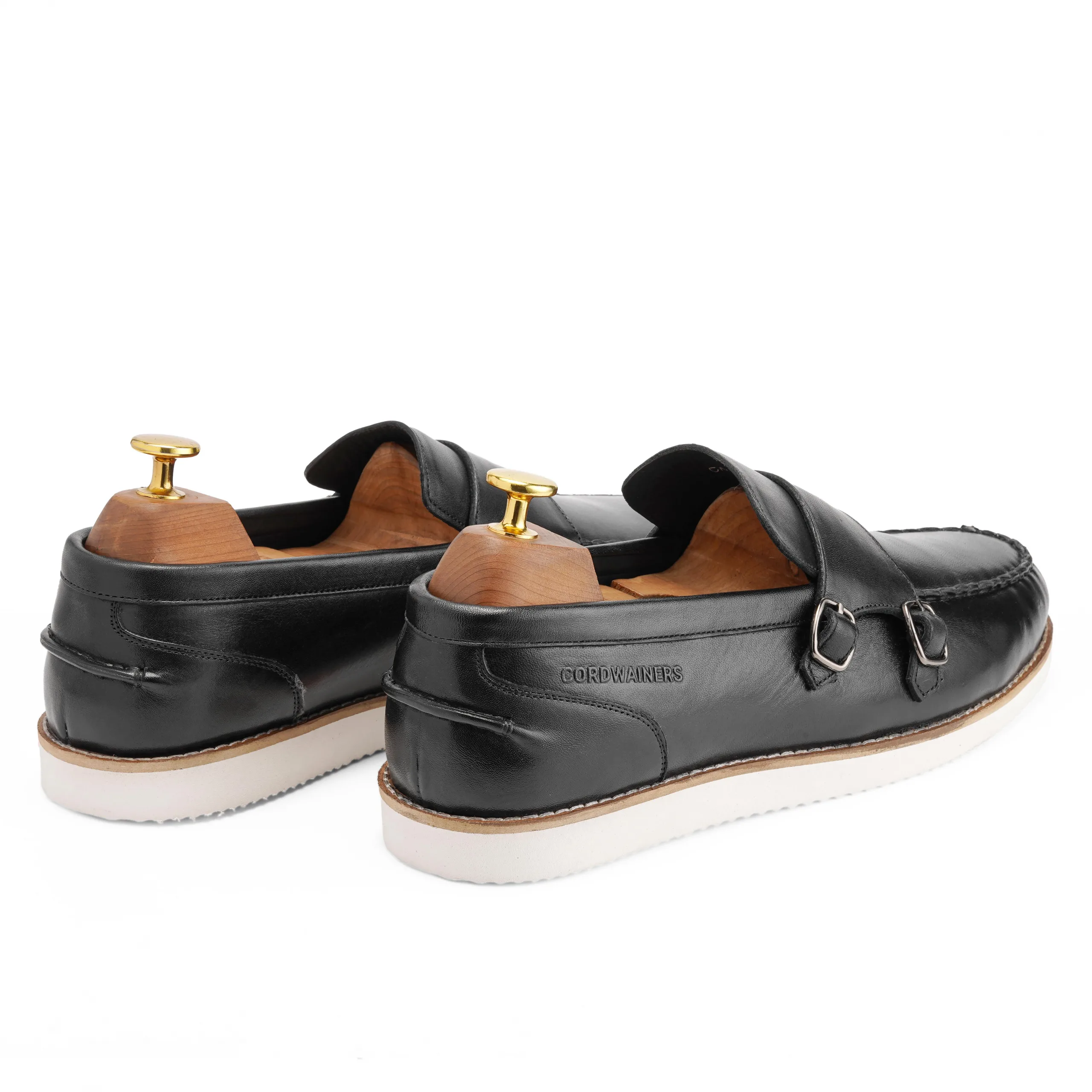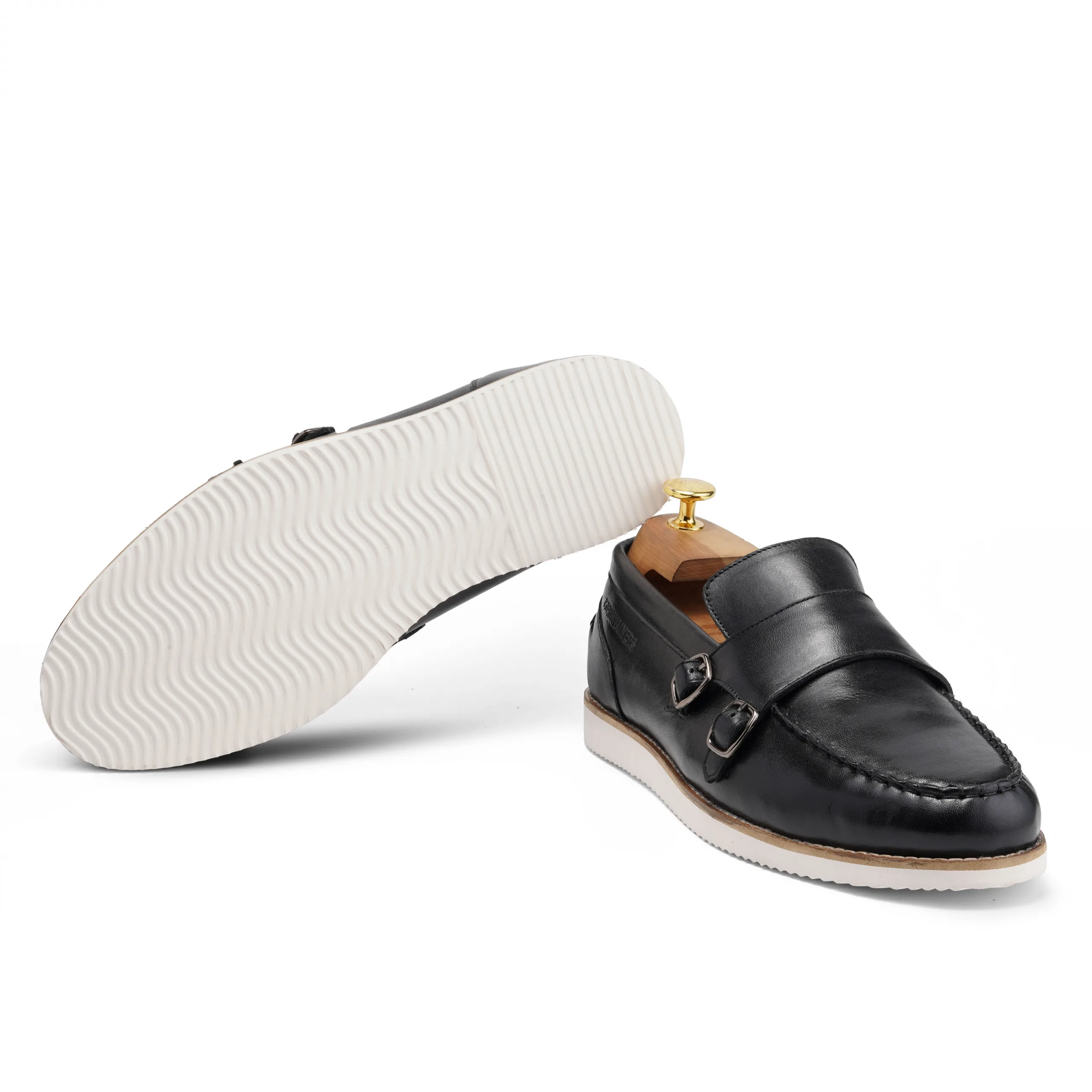 Modern style meets everyday comfort in these Black leather double monk shoes, designed for men who love refined yet relaxed fashion. The white Phylon sole adds a fresh contemporary touch, while the lightweight flat sole design ensures flexibility and ease for daily wear.