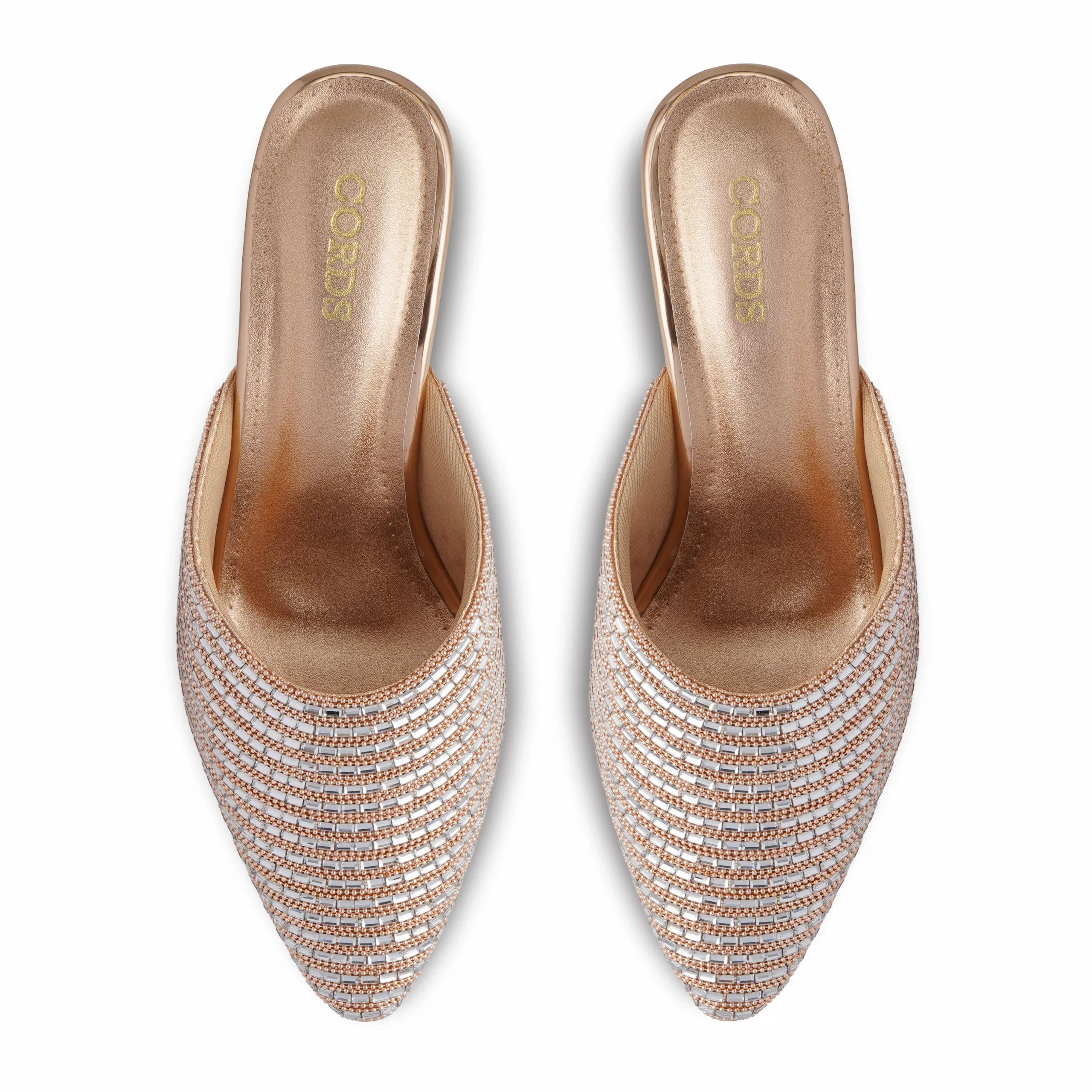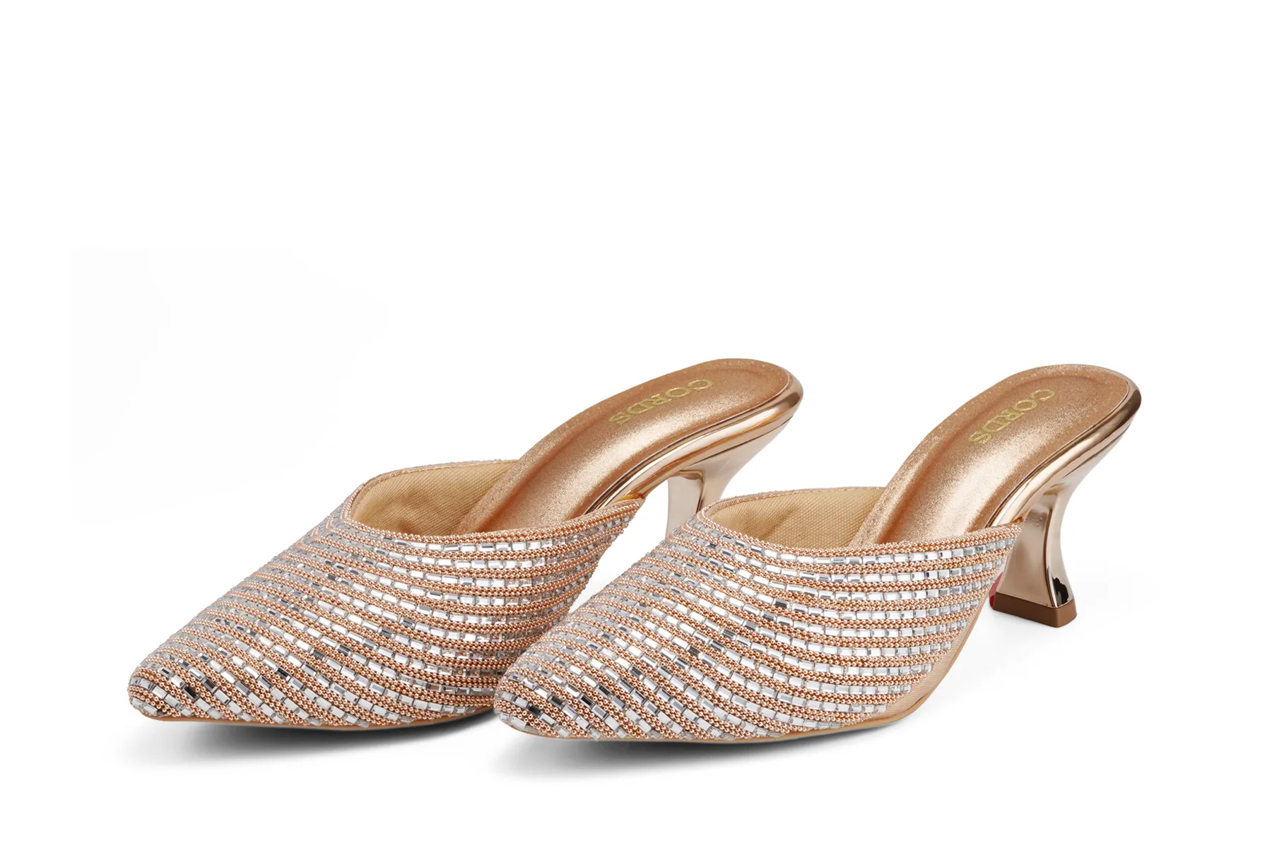 A perfect balance of comfort and glamour, these Rose gold mules elevate your style with every step — reflecting sophistication and festive charm.