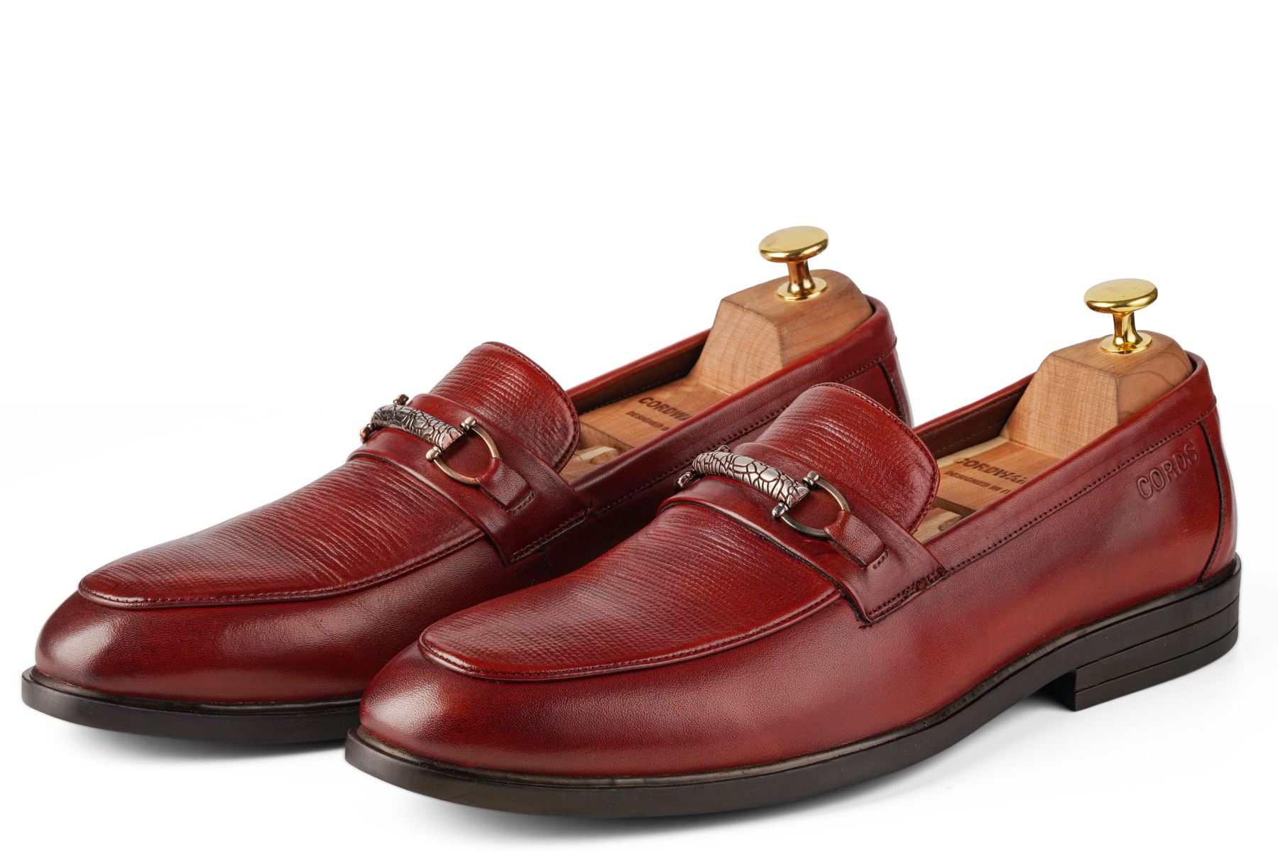 A sleek and stylish lace-less leather loafer shoe in a rich cherry hue, featuring perforation on the vamp for breathability and a refined look. Designed for effortless wear and all-day comfort.