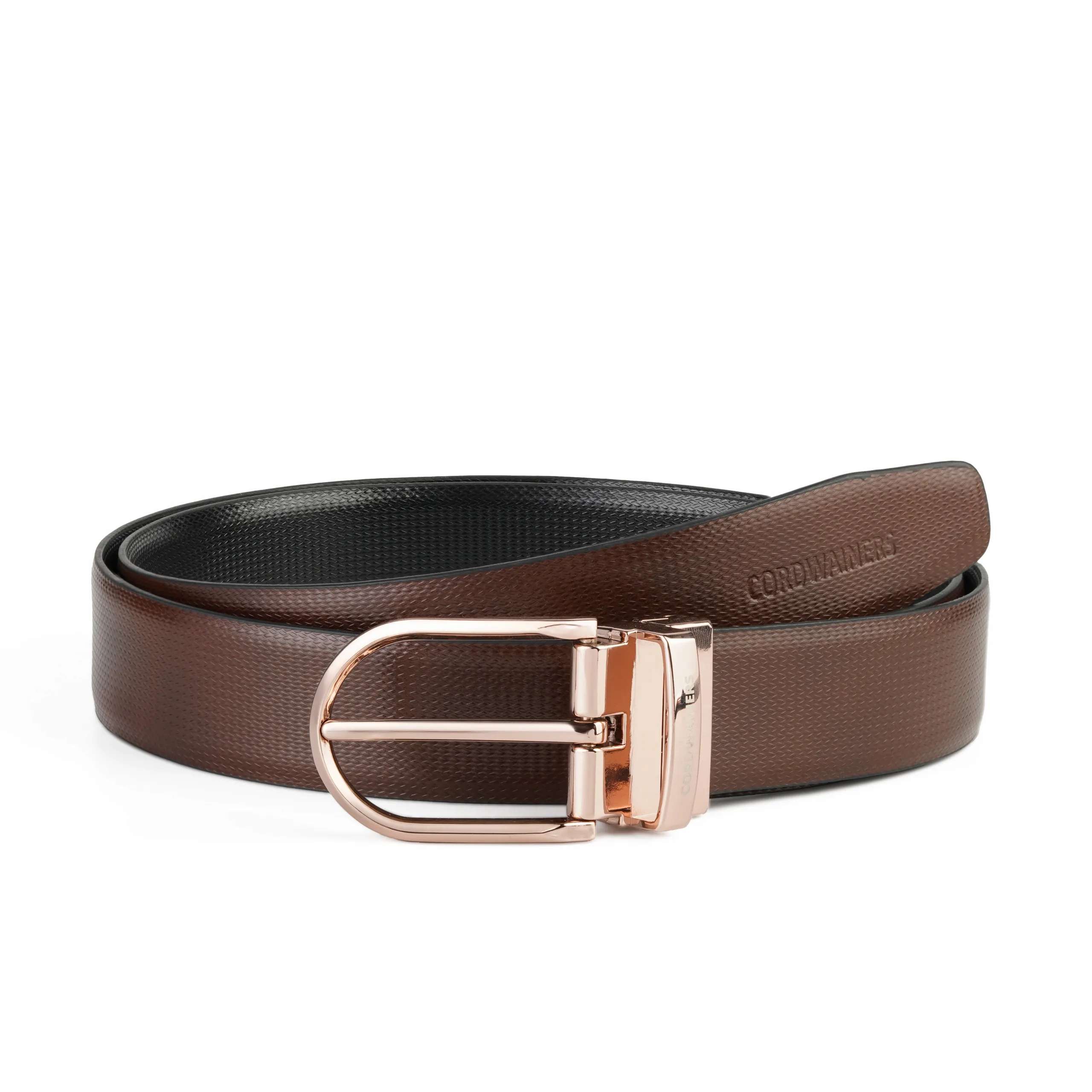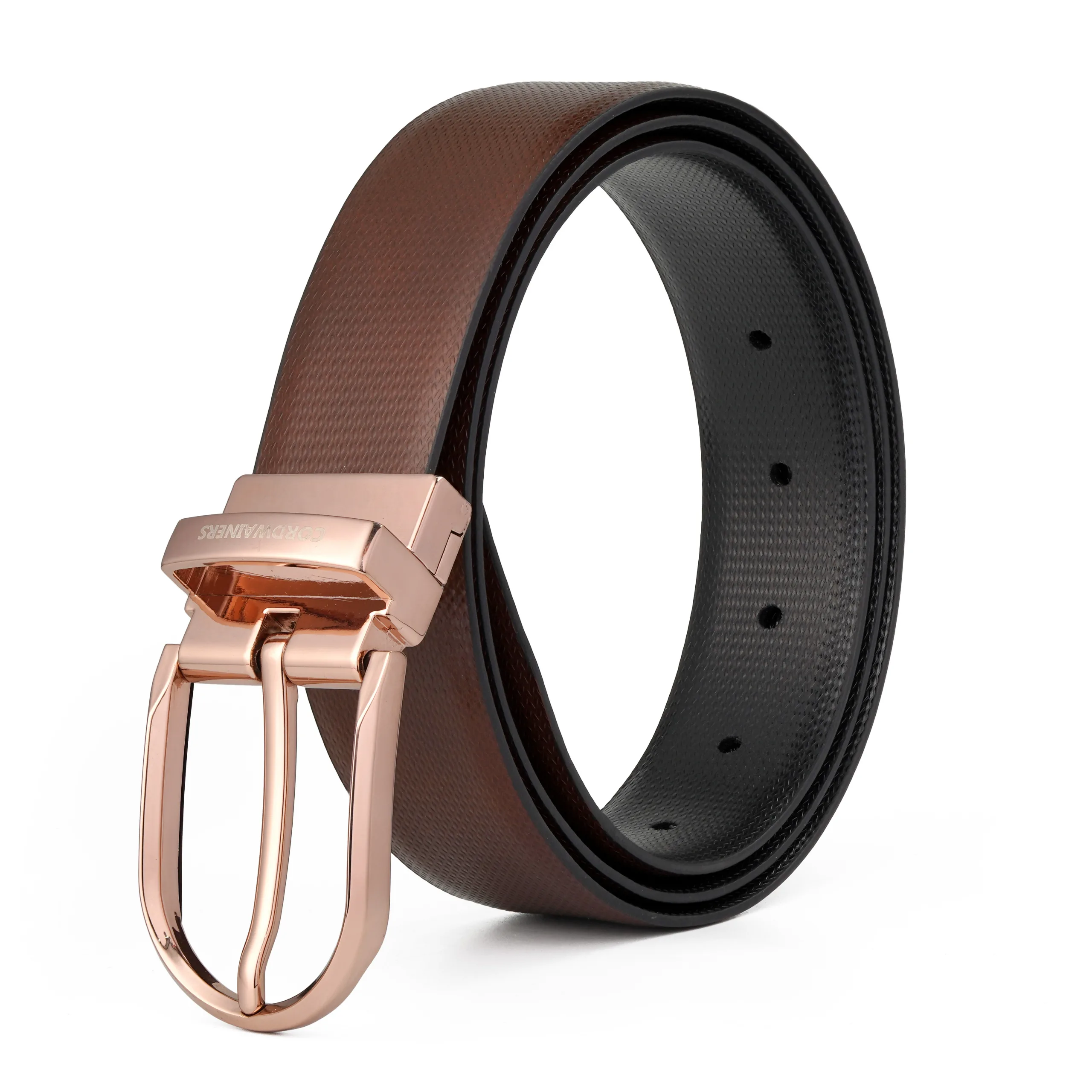 An embodiment of refined taste, this Reversible black and brown leather belt offers both style and function. The rich black and brown tones provide versatile options, while the rose gold buckle adds a touch of modern luxury.