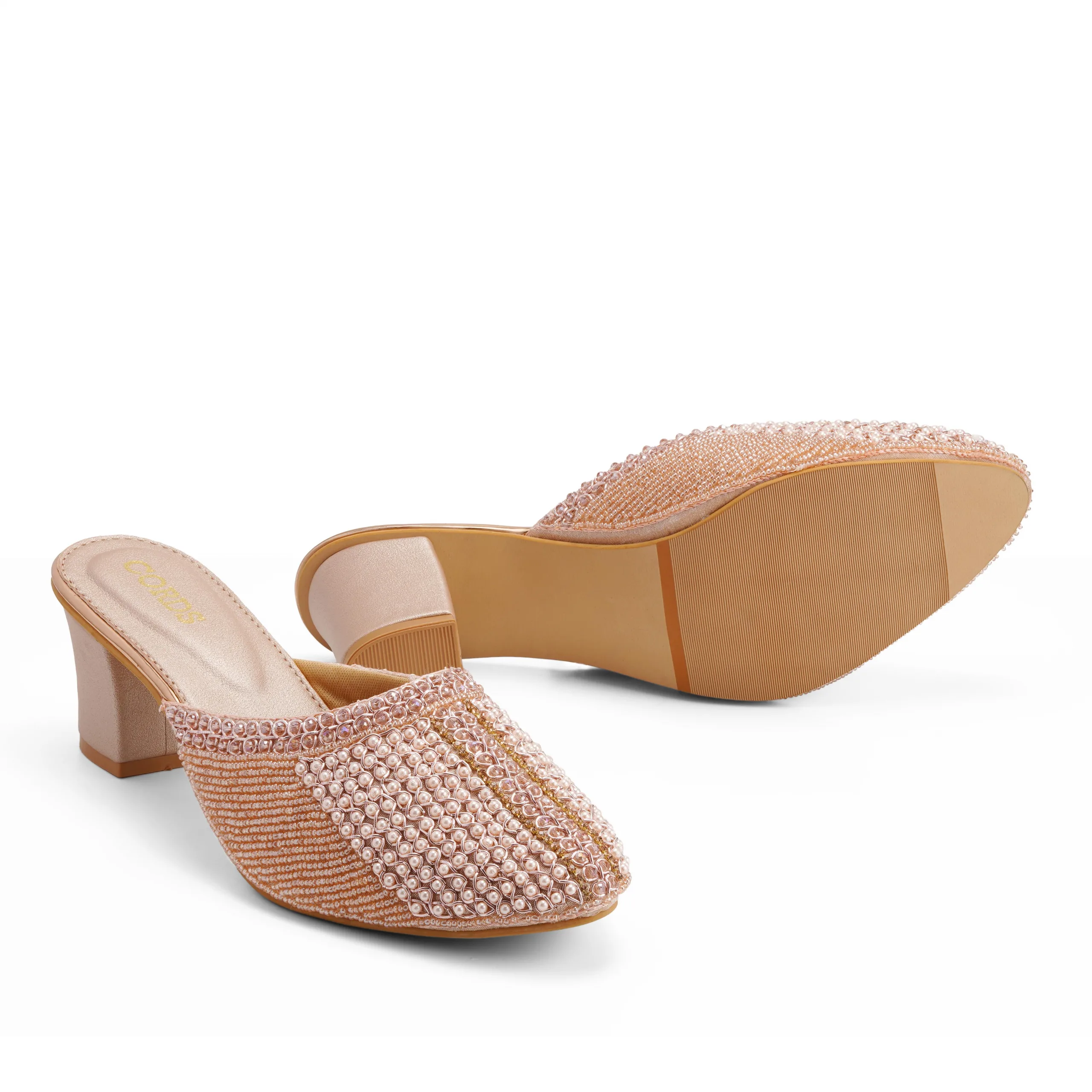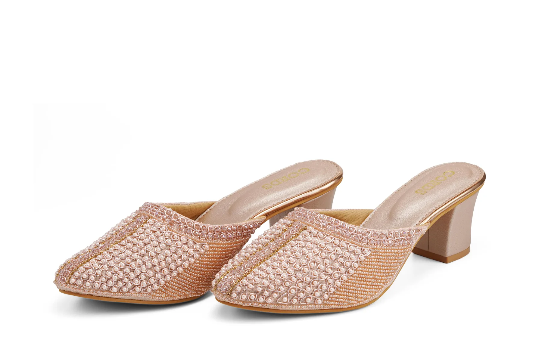 These pink embellished block heel mules bring together heritage-inspired design and modern appeal. Ideal for festive occasions or special evenings, the pair blends intricate detailing with easy wearability for all-day comfort and elegance.