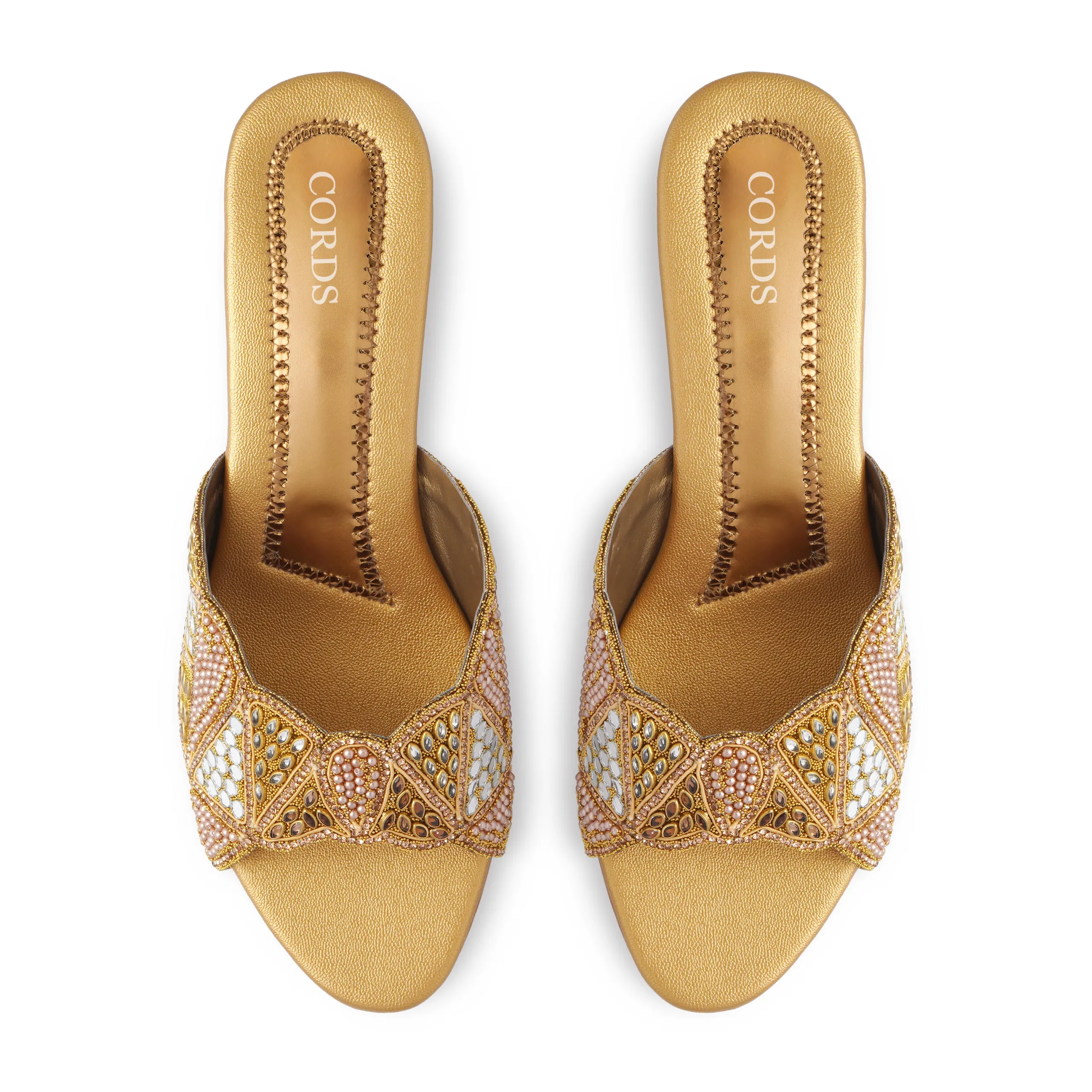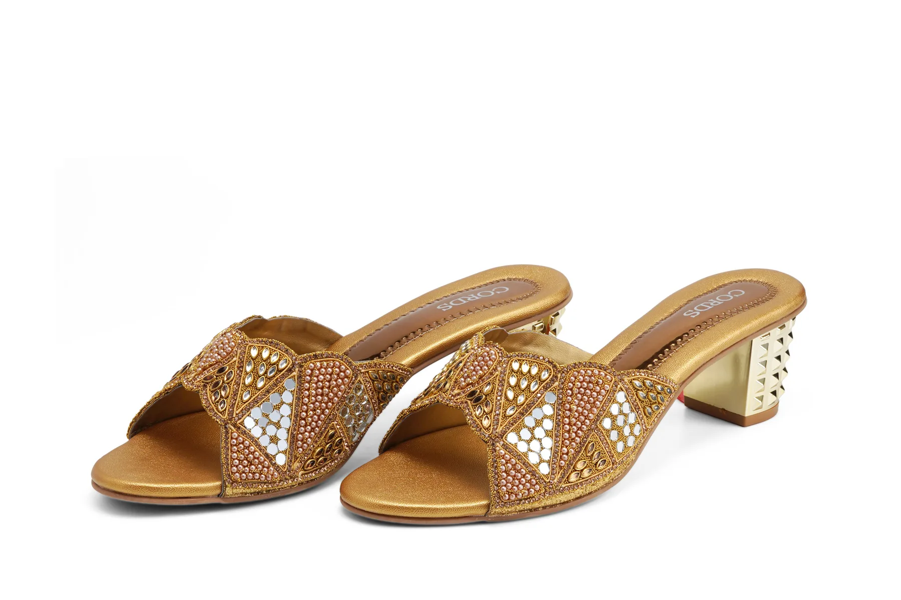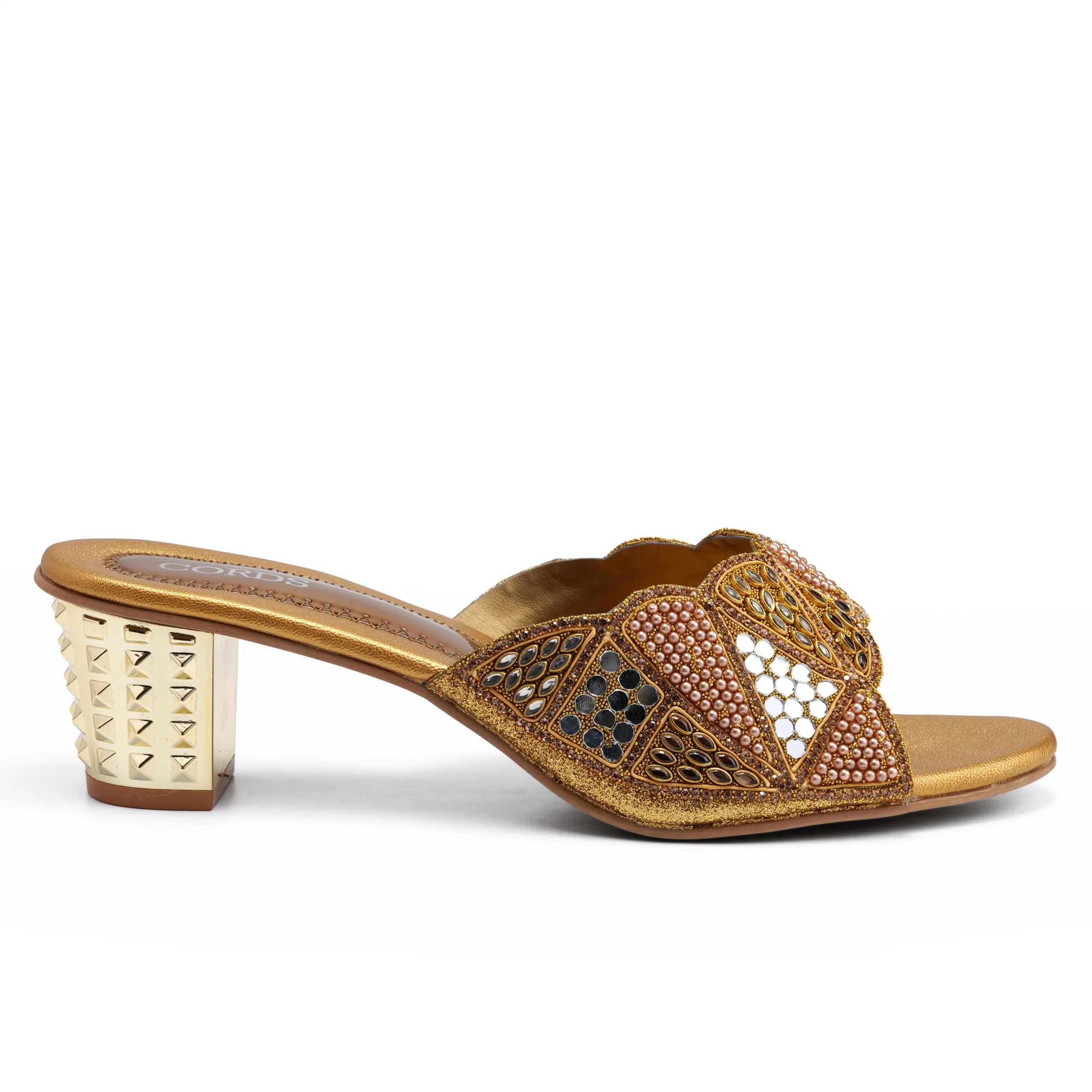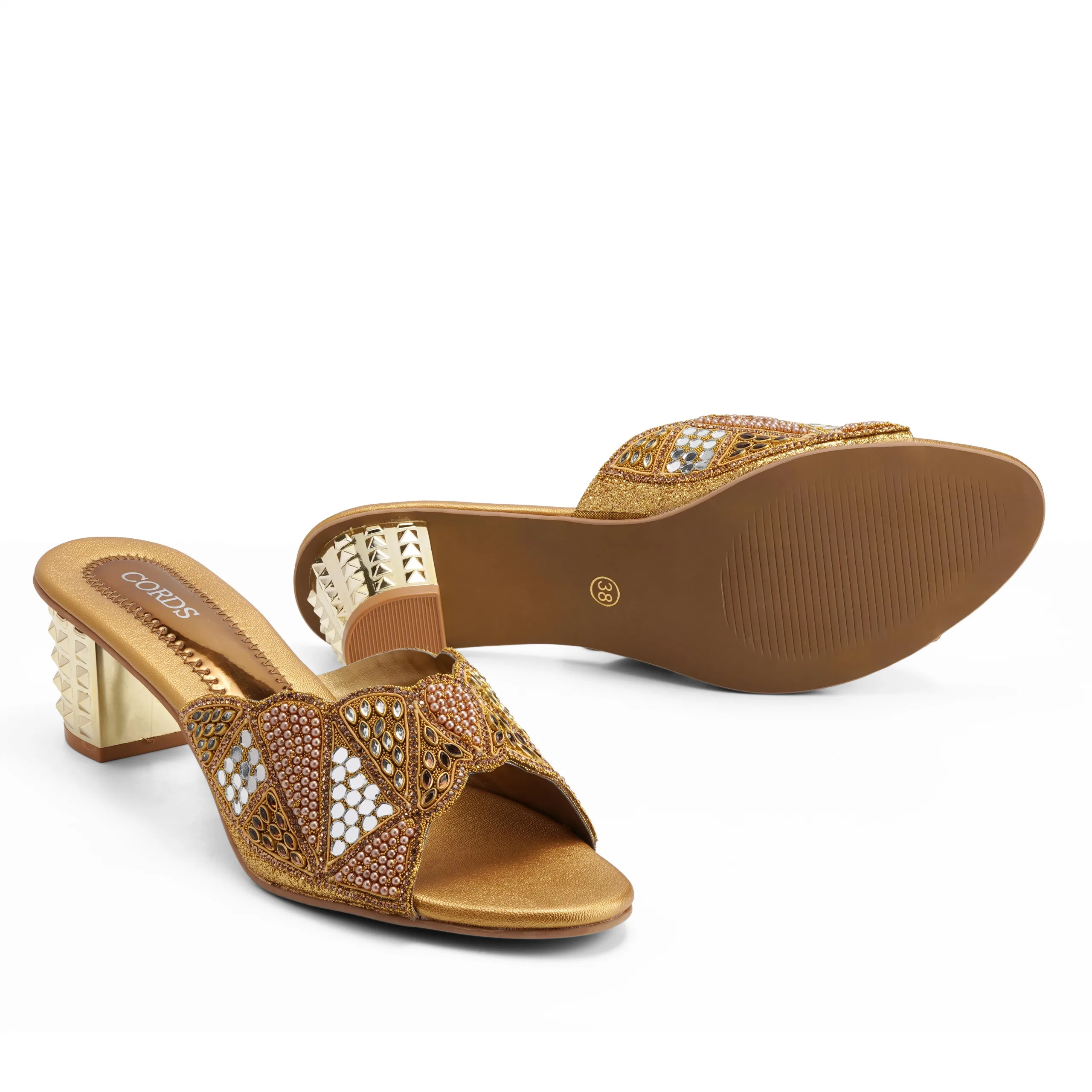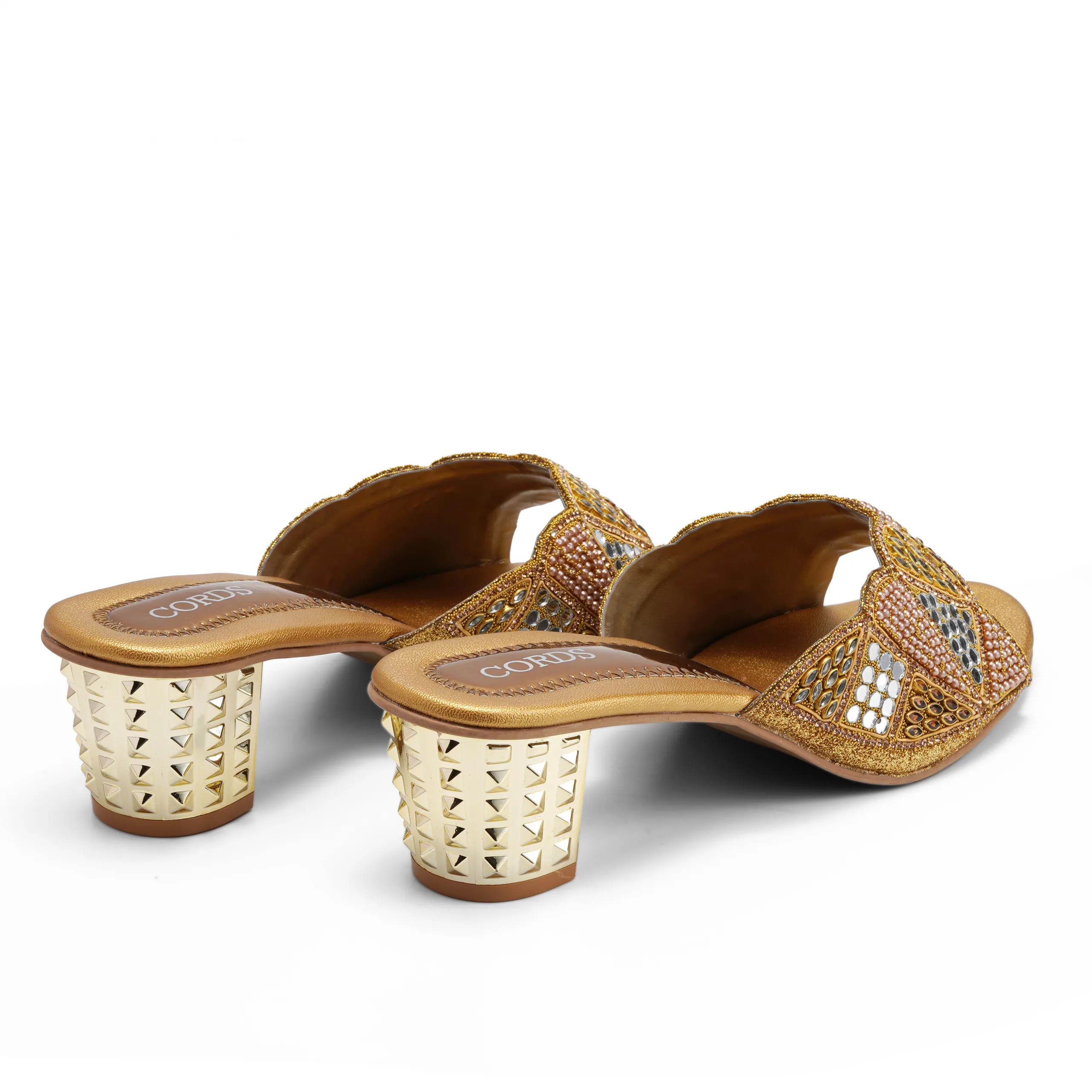 Crafted for the modern woman who values both style and comfort, these Gold block heel slippers are the perfect blend of glamour and grace. The golden heel detail adds a sophisticated touch, making them ideal for festive and evening occasions.