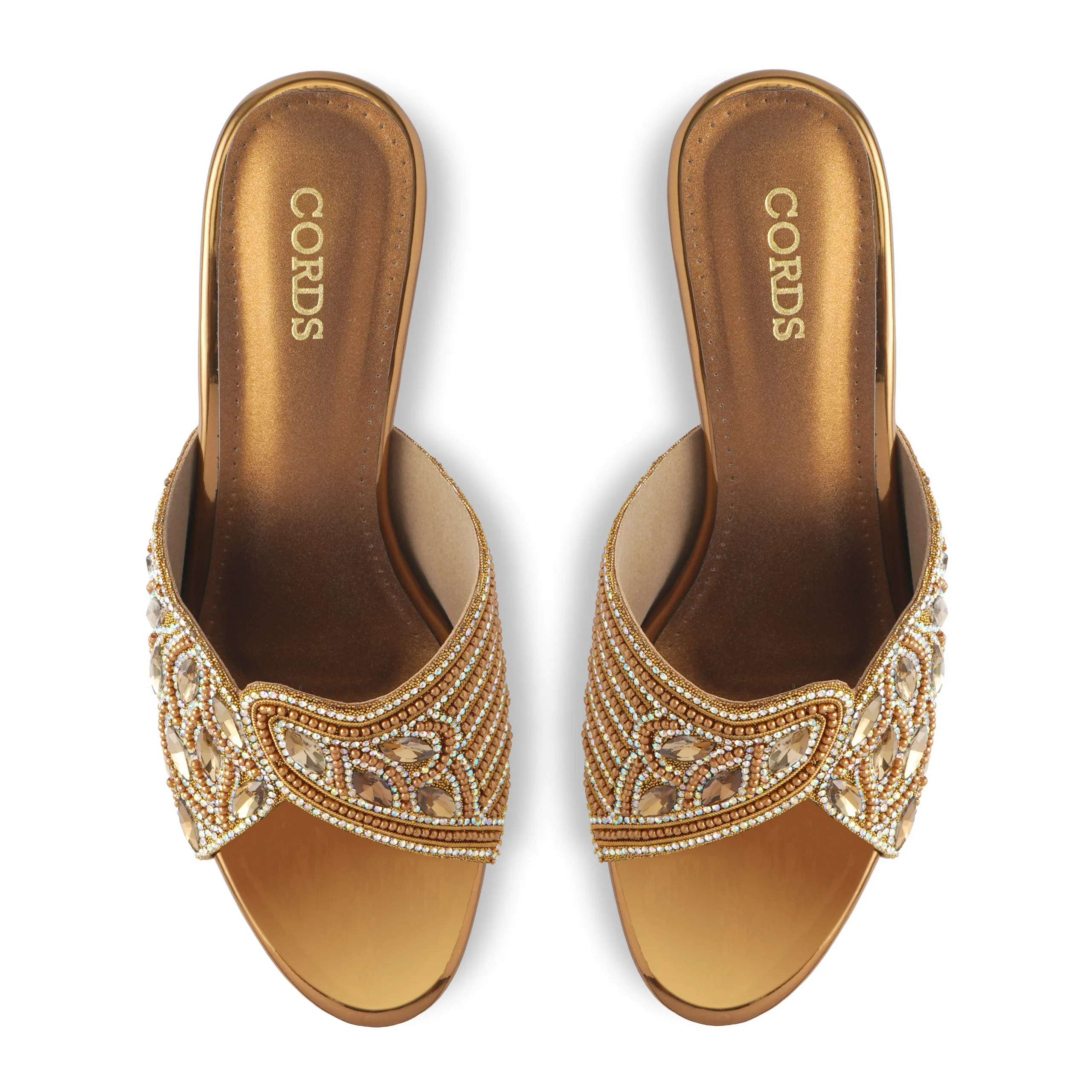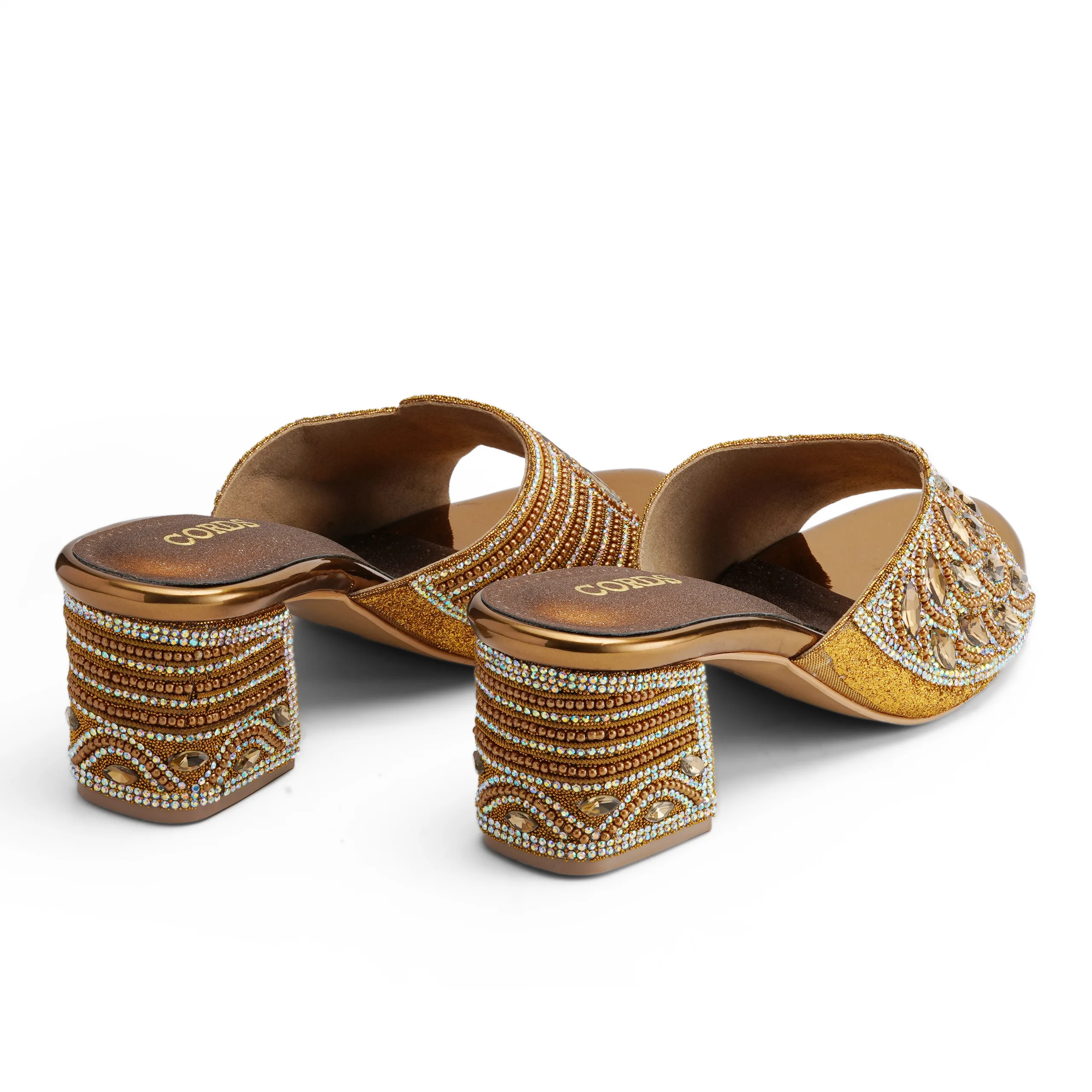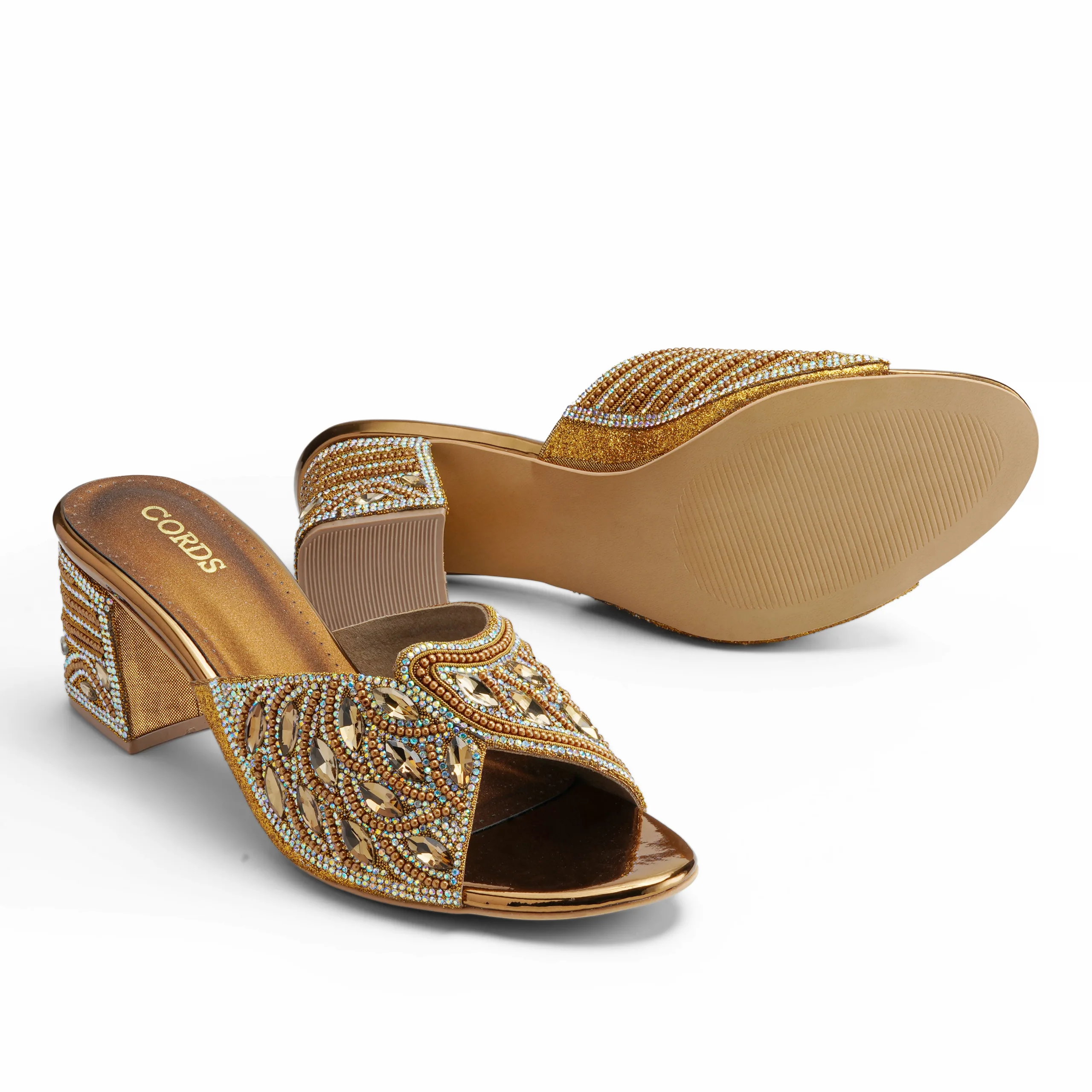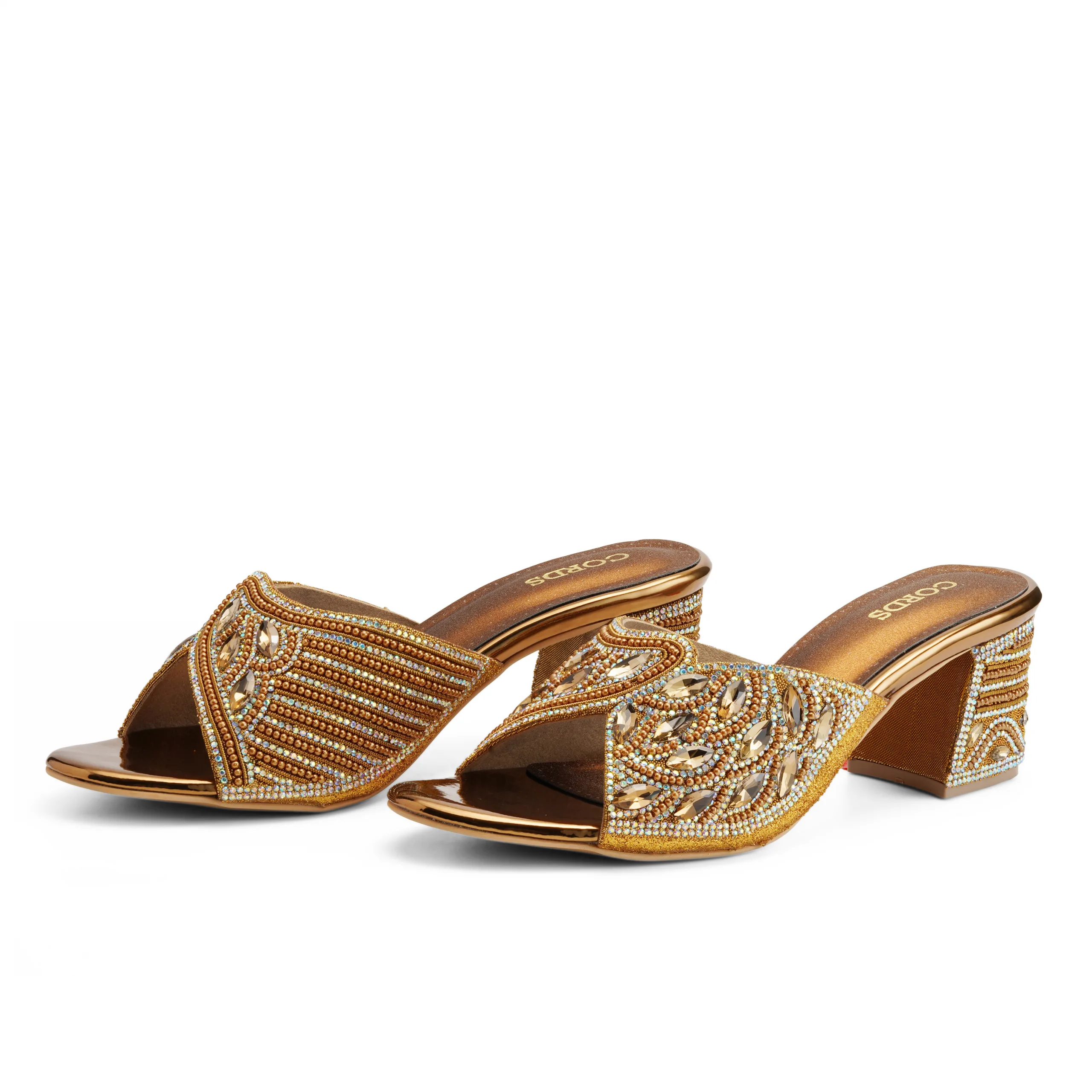 Elevate your special occasions with these golden leather block heels, blending comfort and elegance seamlessly. Designed for party and bridal wear, they feature a TPR sole for stable footing and a soft leather upper that ensures lasting comfort without compromising on style.